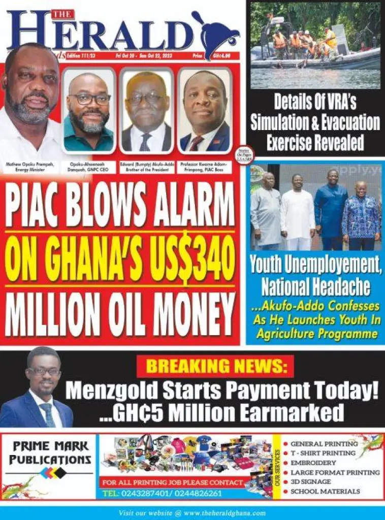 Newspaper headlines: Friday 20th October 2023 Newspaper Headlines October 20, 2023 8:03 am - Audio By Carbonatix FacebookWhatsAppTwitterTelegramEmailPinterestPrint Previous articleDonate your second offerings to Akosombo Dam spillage victims – NYA to churches, MosquesNext articleStop politicising Akosombo dam spillage crisis – Rev. Opuni-Frimpong RELATED ARTICLES Newspaper Headlines Newspaper headlines: Monday, November 24, 2025 Newspaper Headlines Newspaper headlines: Friday, November 21, 2025 Newspaper Headlines Newspaper headlines: Thursday, November 20, 2025