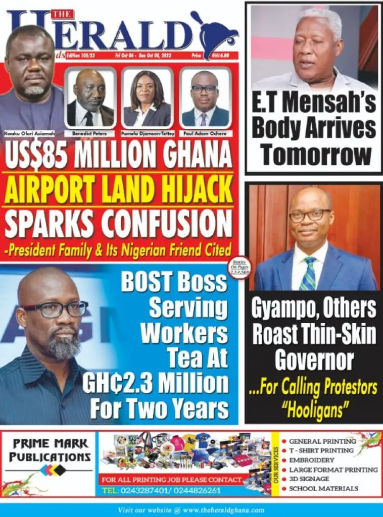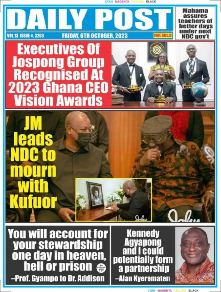 Newspaper headlines: Friday 6th October 2023 Newspaper Headlines October 6, 2023 8:27 am - Audio By Carbonatix FacebookWhatsAppTwitterTelegramEmailPinterestPrint Previous articleECG, GWCL, NEDCo pay GH¢I.2m as compensation to customers  Next articleMohbad: Wanted friend of musician turns himself in RELATED ARTICLES Newspaper Headlines Newspaper headlines: Monday, November 24, 2025 Newspaper Headlines Newspaper headlines: Friday, November 21, 2025 Newspaper Headlines Newspaper headlines: Thursday, November 20, 2025