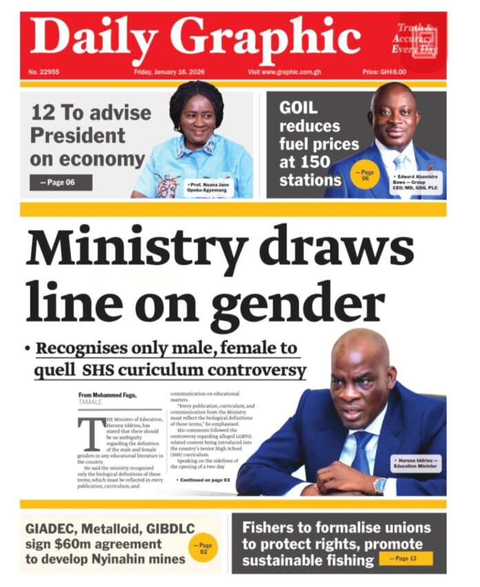 Newspaper headlines: Friday, January 16, 2026 Newspaper Headlines January 16, 2026 7:11 am - Audio By Carbonatix FacebookWhatsAppTwitterTelegramEmailPinterestPrint Previous articleGhana’s IMF Programme remains solid and on track – IMF Resident RepNext articleFiscal discipline, cedi stability made 2025 a ‘very good year’ – IMF TagsNewspaper headlines RELATED ARTICLES Health GHS condemns assault at Akoti Health Centre, calls for immediate probe Hot Video ‘Order from above’ – Trotro operators reply as commuters fume over fare hikes amid gridlock Crime One more arrested as police retrieve vehicle used in Adabraka gold shop robbery