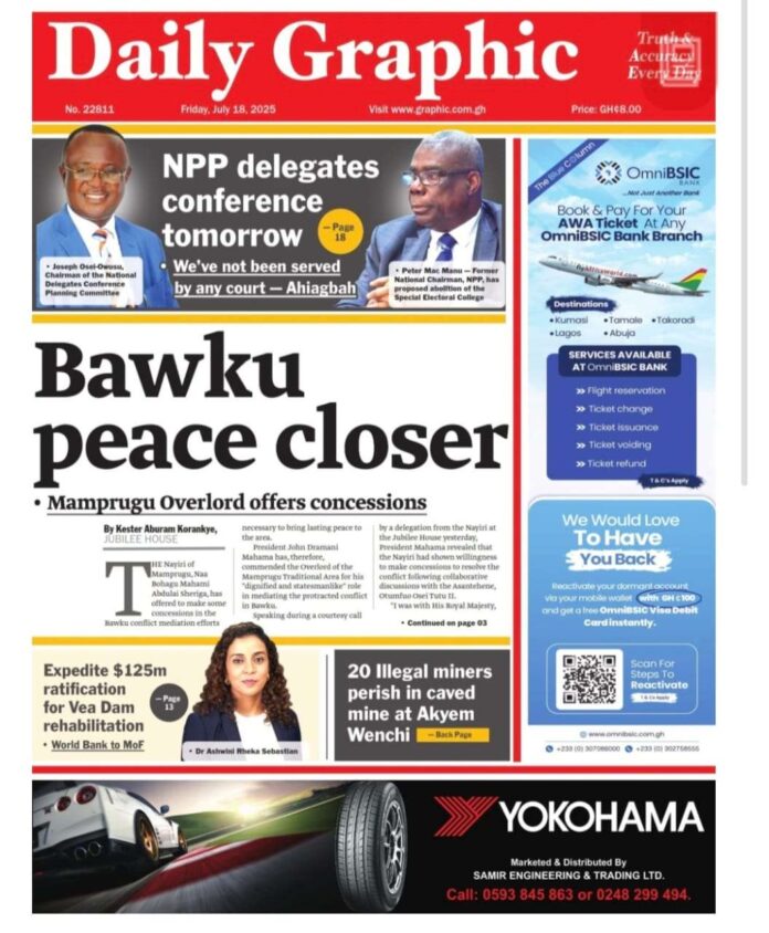 Newspaper headlines: Friday, July 18, 2025 Newspaper Headlines July 18, 2025 7:03 am - Share FacebookWhatsAppTwitterTelegramEmailPinterestPrint FacebookWhatsAppTwitterTelegramEmailPinterestPrint Previous articleUS passes first major national crypto legislationNext articleGAF set to recruit 12,000 personnel TagsNewspaper headlines RELATED ARTICLES Education Haruna Iddrisu announces plans to extend university charter deadline Local News Hwidiem clashes: Nothing will stop me in the fight against galamsey – Asutifi North MP News Bernard Ahiafor and Collins Dauda sworn in as members of Pan-African Parliament