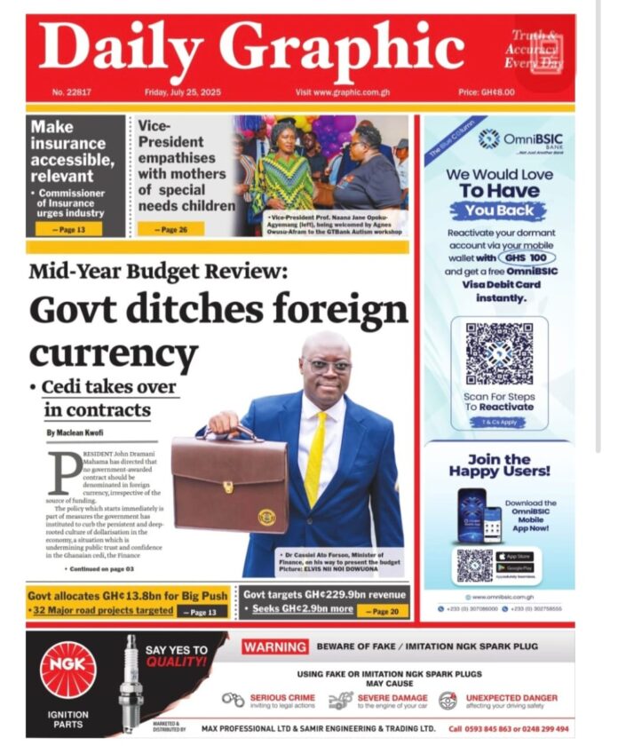 Newspaper headlines: Friday, July 25, 2025 Newspaper Headlines July 25, 2025 7:15 am - Share FacebookWhatsAppTwitterTelegramEmailPinterestPrint FacebookWhatsAppTwitterTelegramEmailPinterestPrint Previous articleAppointments Committee vets final Deputy Ministerial nominees todayNext articleArsenal sign Valencia defender Mosquera TagsNewspaper headlines RELATED ARTICLES Crime 11 suspects to face prosecution for 2020 and 2024 election violence Elections Muntaka confirms 15 deaths and 40 injuries from 2020 and 2024 election violence Entertainment News I was the female voice on P-Square’s ‘Do Me’ but earned nothing – Waje