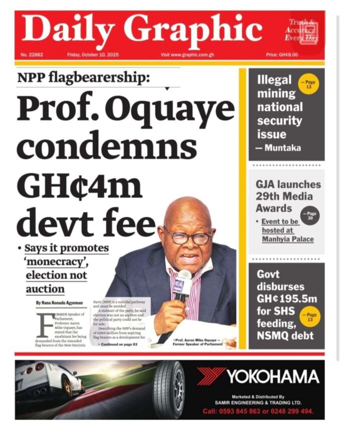Newspaper headlines: Friday, October 10, 2025 Newspaper Headlines October 10, 2025 6:24 am - Share FacebookWhatsAppTwitterTelegramEmailPinterestPrint FacebookWhatsAppTwitterTelegramEmailPinterestPrint Previous articleBBC tracks down sextortion scammer targeting teenage boysNext articleUS Department of Homeland Security now plans to deport Abrego Garcia to Ghana TagsNewspaper headlines RELATED ARTICLES News Burkinabé driver escapes death in accident on Accra–Kumasi Highway News Concerned Small Scale Miners Association wants EPA to enforce ban on ‘Changfan’ machines to protect river bodies