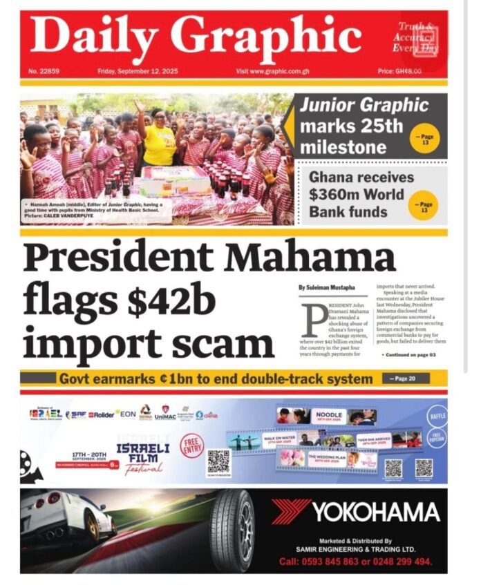 Newspaper headlines: Friday, September 12, 2025 Newspaper Headlines September 12, 2025 7:11 am - Share FacebookWhatsAppTwitterTelegramEmailPinterestPrint FacebookWhatsAppTwitterTelegramEmailPinterestPrint Previous article2025/26 GHPL MD1: Hearts of Oak host Hohoe United, Kotoko travel to ChelseaNext articleSouth Sudan vice-president charged with murder and treason TagsNewspaper headlines RELATED ARTICLES Local News Pastor urges church to take firm stand against homosexuality Local News Volta Region positioned as Ghana’s next growth frontier in 24-hour economy drive – Regional Minister News Nkwanta South Assembly to prosecute sanitation offenders