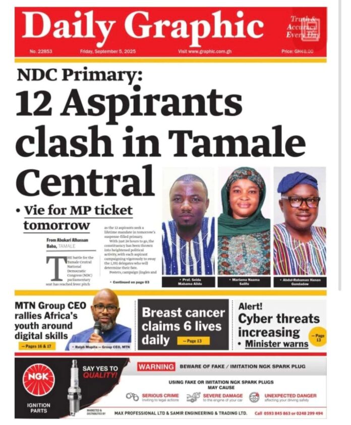 Newspaper headlines: Friday, September 5, 2025 Newspaper Headlines September 5, 2025 7:26 am - Share FacebookWhatsAppTwitterTelegramEmailPinterestPrint FacebookWhatsAppTwitterTelegramEmailPinterestPrint Previous articleSome GES officials took GH¢60 to aid cheating in 2025 BECE – JoyNews exposéNext articleBusinessman in court over GH¢500K gold fraud TagsNewspaper headlines RELATED ARTICLES Crime 11 suspects to face prosecution for 2020 and 2024 election violence Elections Muntaka confirms 15 deaths and 40 injuries from 2020 and 2024 election violence Entertainment News I was the female voice on P-Square’s ‘Do Me’ but earned nothing – Waje