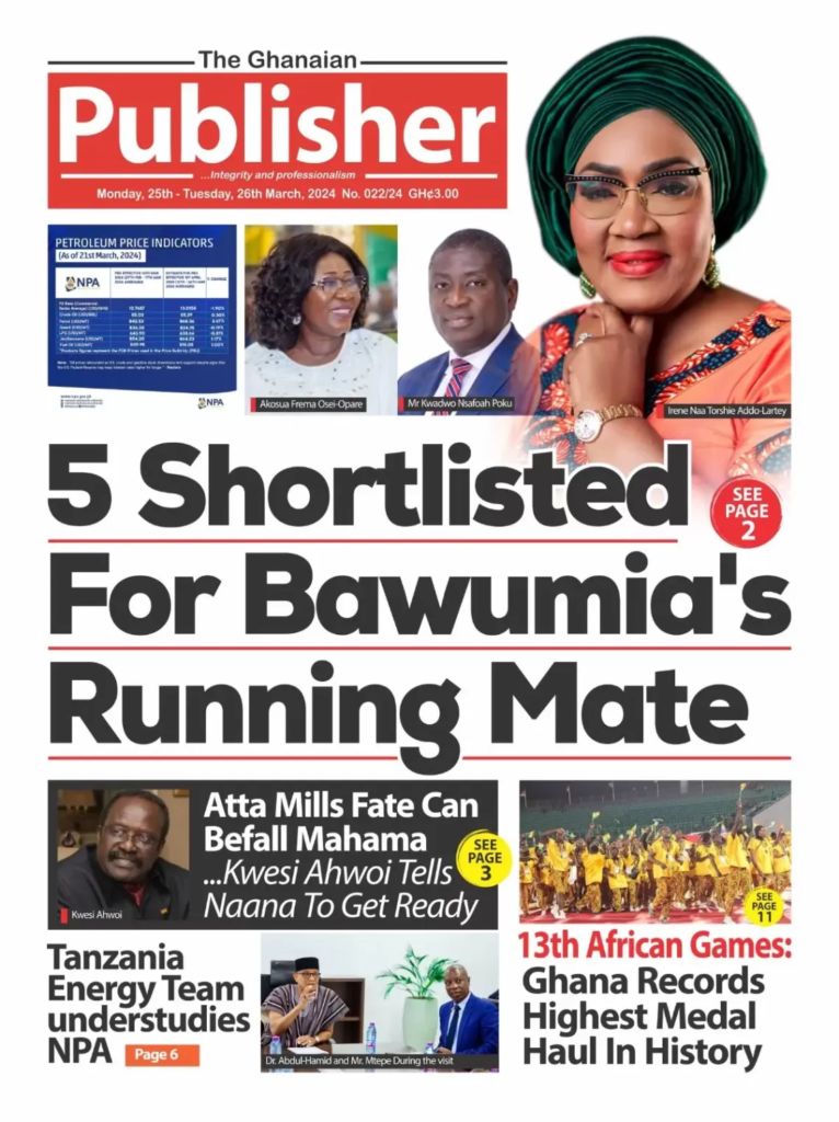 Newspaper headlines: Monday 25th March 2024 Newspaper Headlines March 25, 2024 5:41 am - Audio By Carbonatix FacebookWhatsAppTwitterTelegramEmailPinterestPrint Previous articleCape Coast Technical University to manufacture noise free trolleys for Teaching HospitalNext articleEcobank Group signs United Nations (UN) Women’s Empowerment Principles TagsNewspaper headlines RELATED ARTICLES Local News John Kumah’s widow, Lilian Owusu remarries Business MIIF, Gold Fields Executives hold strategic talks on potential investment opportunities Business Over 2,800 crates of eggs sold at The Multimedia Group’s X’mas Egg Market as consumers express satisfaction