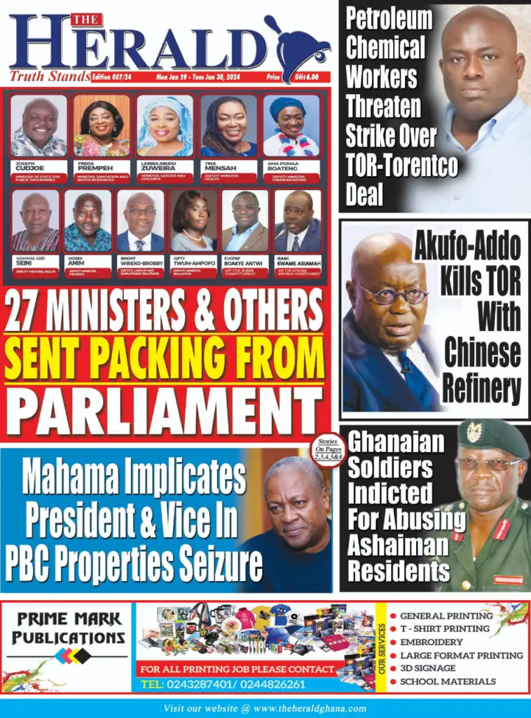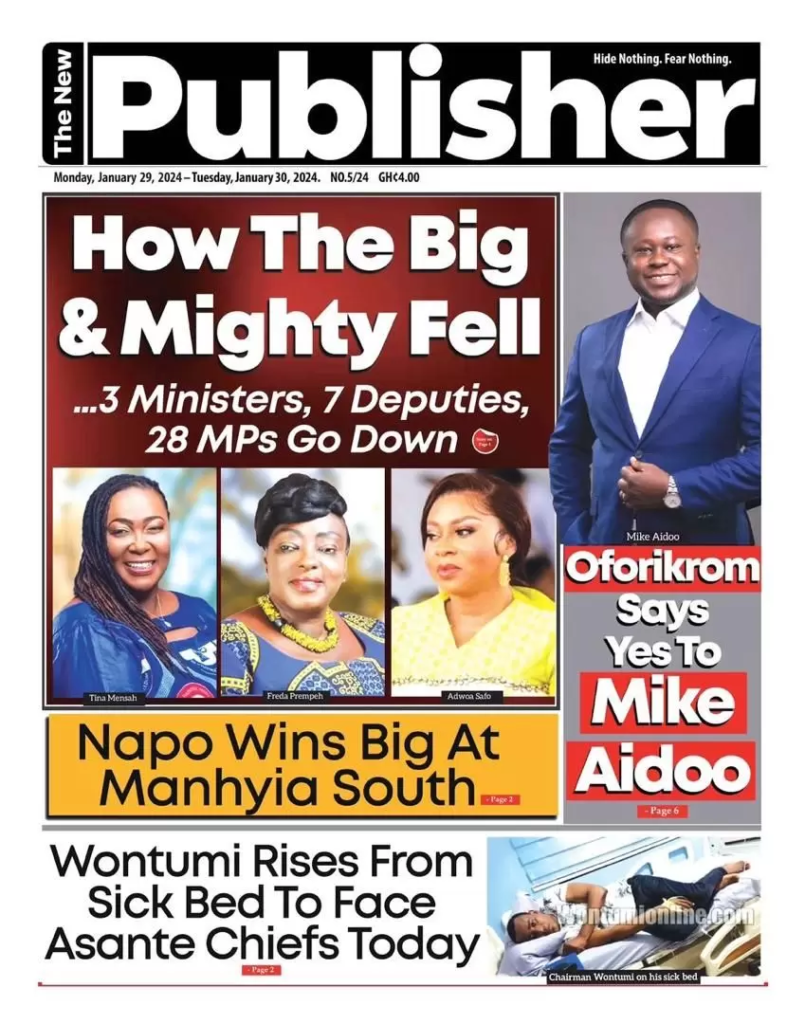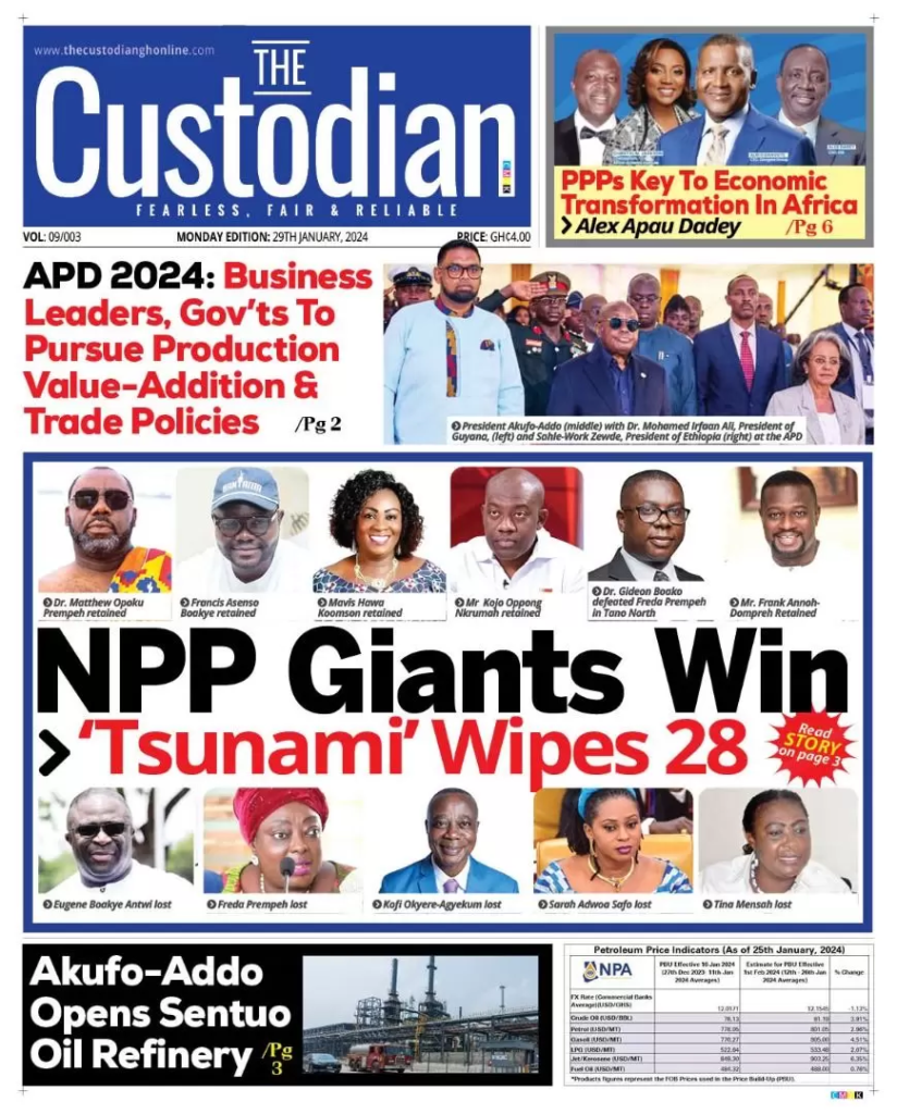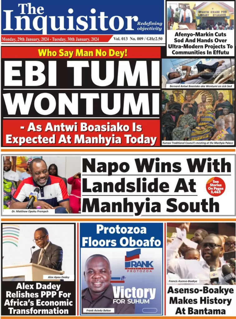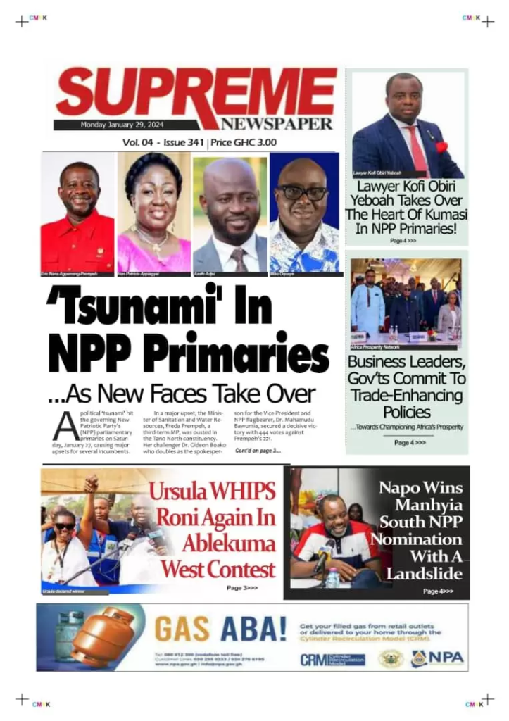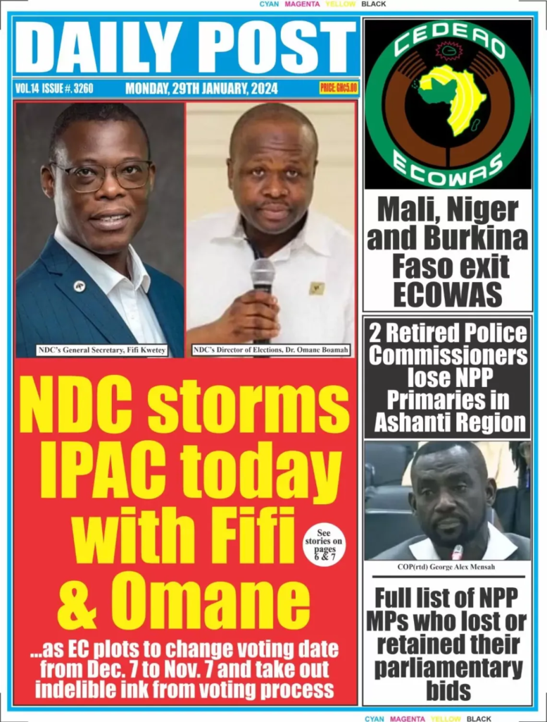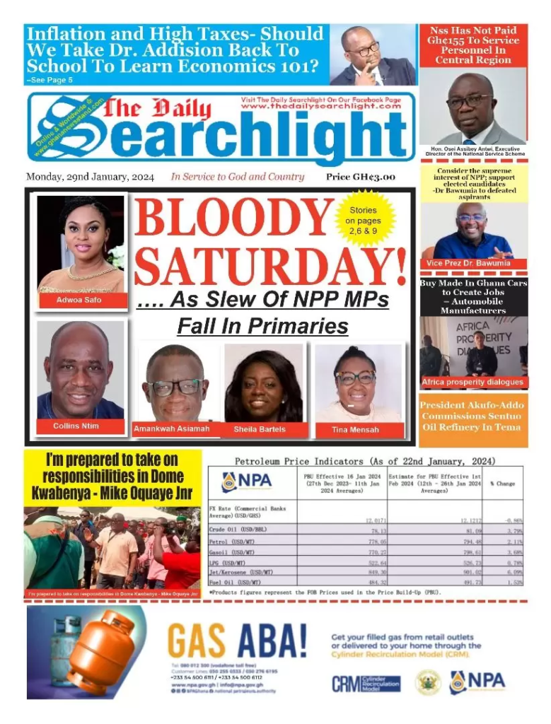 Newspaper headlines: Monday 29th January 2024 Newspaper Headlines January 29, 2024 6:27 am - Audio By Carbonatix FacebookWhatsAppTwitterTelegramEmailPinterestPrint Previous articleNPP Youth Organiser attacks Chairman in church [Video]Next article#BlackExcellence: Strategies for Capital Access in the Global Economy TagsNewspaper headlines RELATED ARTICLES Entertainment The Oscars to leave ABC and stream on YouTube starting in 2029 Entertainment TikTok owner signs agreements to avoid US ban News Six drivers arrested as Accra Mayor leads taskforce over unapproved fares