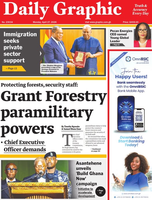 Newspaper headlines: Monday, April 27, 2026 Newspaper Headlines April 27, 2026 7:18 am - Audio By Carbonatix DISCLAIMER: The Views, Comments, Opinions, Contributions and Statements made by Readers and Contributors on this platform do not necessarily represent the views or policy of Multimedia Group Limited. FacebookWhatsAppXTelegramEmailPinterestPrint Previous articleAMA court convicts three for open defecation and illegal dumping in AccraNext articleSee the areas that will be affected by ECG’s planned maintenance today TagsNewspaper headlines RELATED ARTICLES Local News Youth Development Minister reiterates government’s commitment to improving lives of young people Local News Asiedu Nketia begins Upper East Thank-You Tour Local News Mahama praises Julius Debrah for loyalty, kindness at 60th birthday thanksgiving