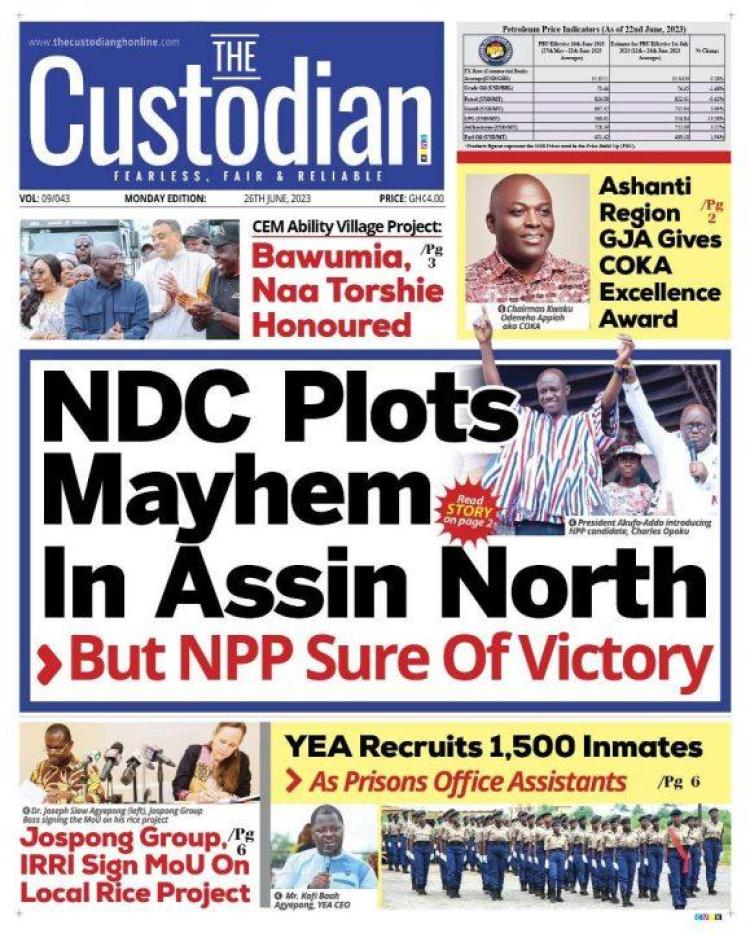 Newspaper Headlines: Monday, June 26, 2023 Newspaper Headlines June 26, 2023 8:41 am - Audio By Carbonatix FacebookWhatsAppTwitterTelegramEmailPinterestPrint Previous articleMASLOC signs MoU with Association of Small IndustriesNext articleGhana’s EOCO, Nigeria EFCC sign MOU to combat trans-border organized crimes RELATED ARTICLES Newspaper Headlines Newspaper headlines: Monday, November 24, 2025 Newspaper Headlines Newspaper headlines: Friday, November 21, 2025 Newspaper Headlines Newspaper headlines: Thursday, November 20, 2025