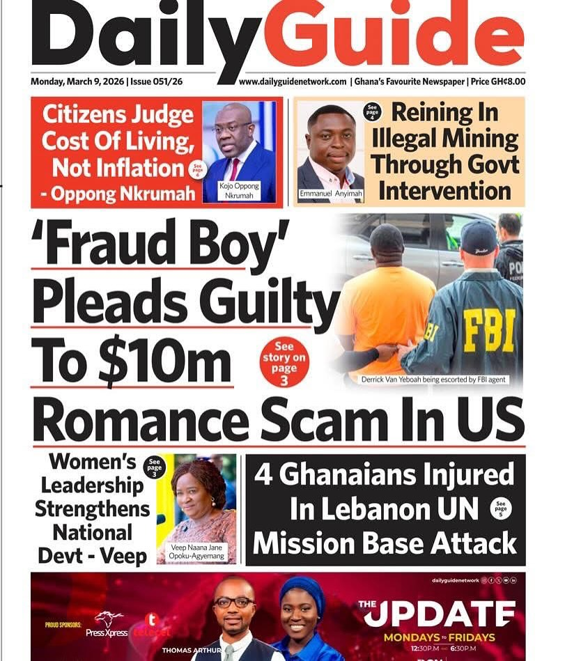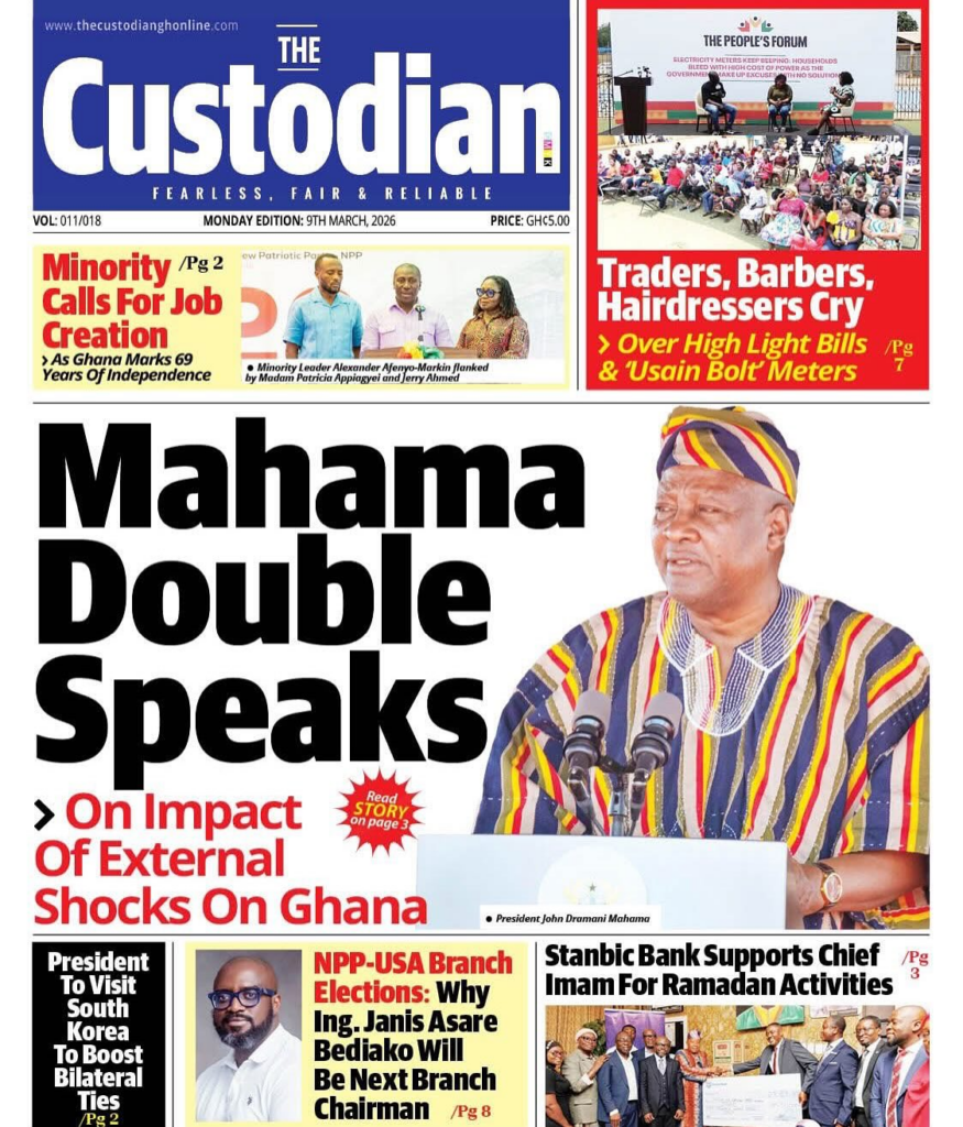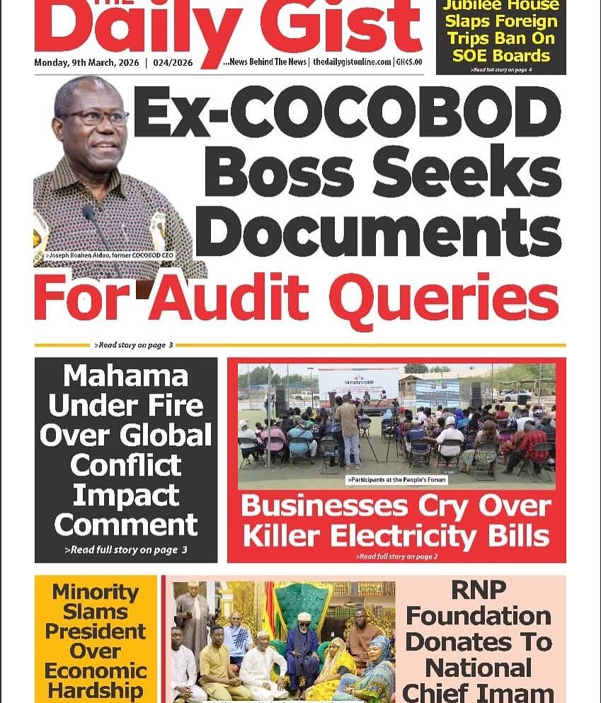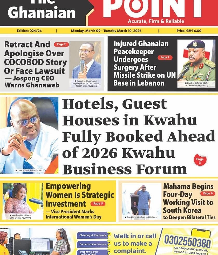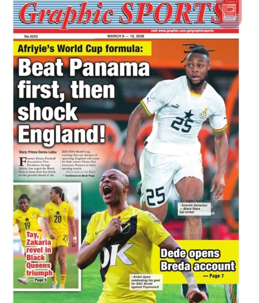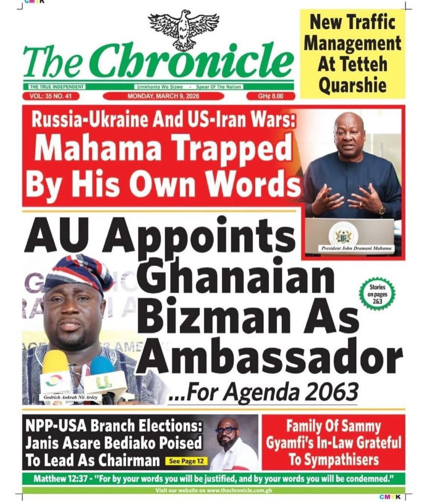 Newspaper headlines: Monday, March 9, 2026 Newspaper Headlines March 9, 2026 7:23 am - Audio By Carbonatix FacebookWhatsAppXTelegramEmailPinterestPrint Previous articlePolice arrest robbery suspect at Airport Residential AreaNext articleCLOGSAG begins indefinite nationwide strike today despite NLC’s order TagsNewspaper headlines RELATED ARTICLES Local News Cocoa farmers received as little as 30% of FOB price under Akufo-Addo – Otokunor Features Galamsey chemicals and air pollution linked to rising diabetes risk in children Local News ‘Such crimes are against humanity’ — Peter Otokunor backs prosecution of former COCOBOD officials