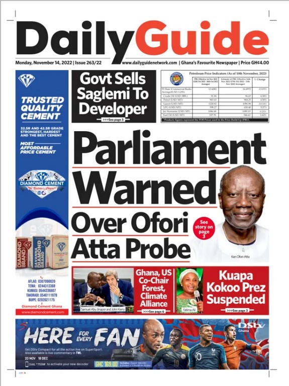 Newspaper Headlines: Monday, November 14, 2022 Newspaper Headlines November 14, 2022 8:34 am - Audio By Carbonatix FacebookWhatsAppTwitterTelegramEmailPinterestPrint Previous article‘I feel betrayed’ – Cristiano Ronaldo hits out at Man Utd and Erik Ten HagNext articleGalamsey Economy exposé: Why Akufo-Addo sacked Charles Adu Boahen RELATED ARTICLES Newspaper Headlines Newspaper headlines: Monday, November 24, 2025 Newspaper Headlines Newspaper headlines: Friday, November 21, 2025 Newspaper Headlines Newspaper headlines: Thursday, November 20, 2025