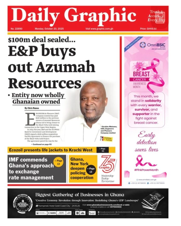 Newspaper headlines: Monday, October 20, 2025 Newspaper Headlines October 20, 2025 7:01 am - Share FacebookWhatsAppTwitterTelegramEmailPinterestPrint FacebookWhatsAppTwitterTelegramEmailPinterestPrint Previous articleWestern Regional Minister urges vigilance as Ivorians flee pre-election violenceNext articleArmwrestling: Central Region to become Ghana’s hub – Abass Sulley TagsNewspaper headlines RELATED ARTICLES Local News I left Ghana Prisons Service so my wife could stay – Justice Baffoe-Bonnie News CJ nominee Baffoe-Bonnie vows to restore confidence in Ghana’s judiciary Local News Justice Paul Baffoe-Bonnie defends nomination as Chief Justice, dismisses claims of political reward