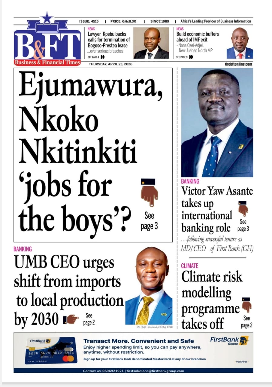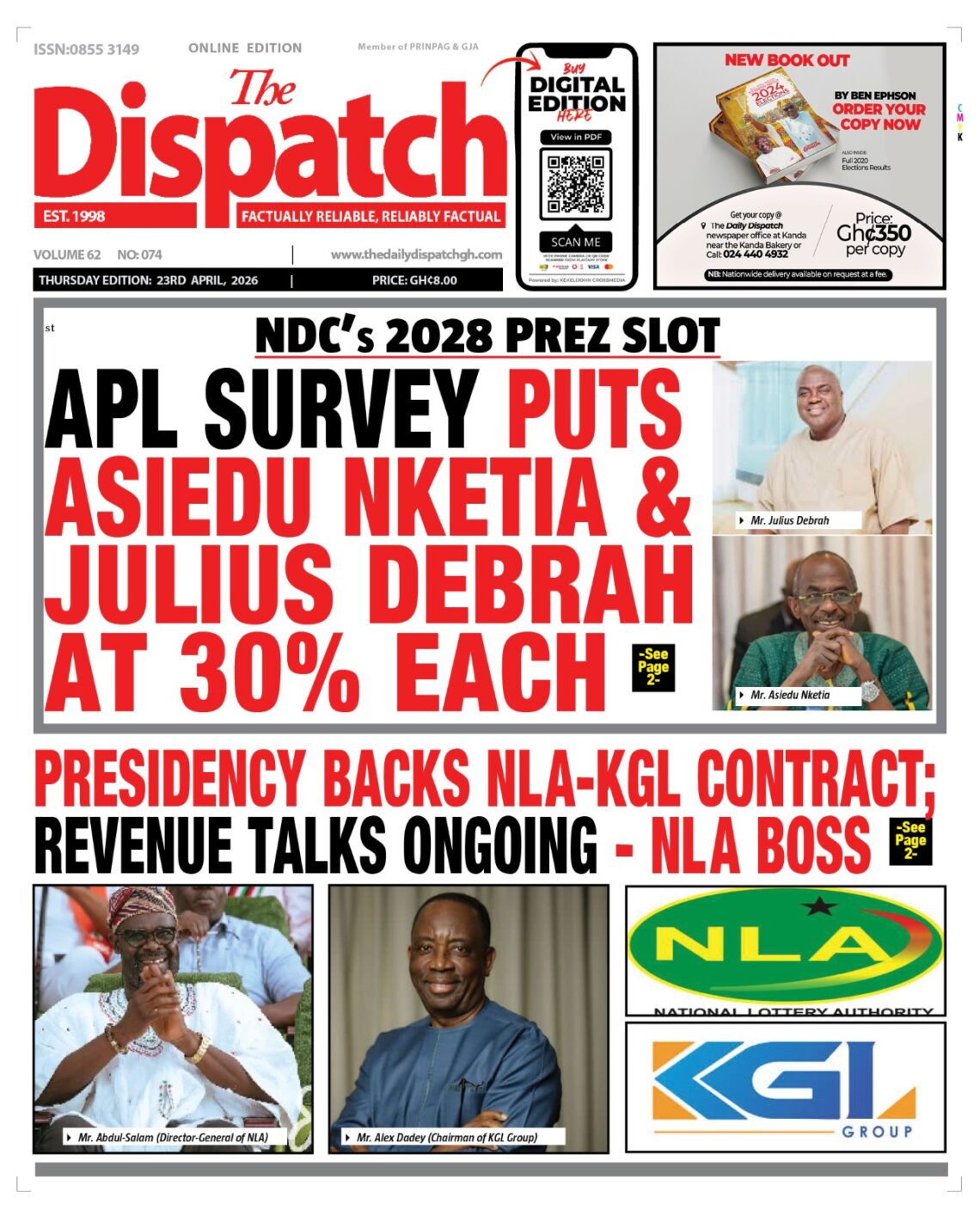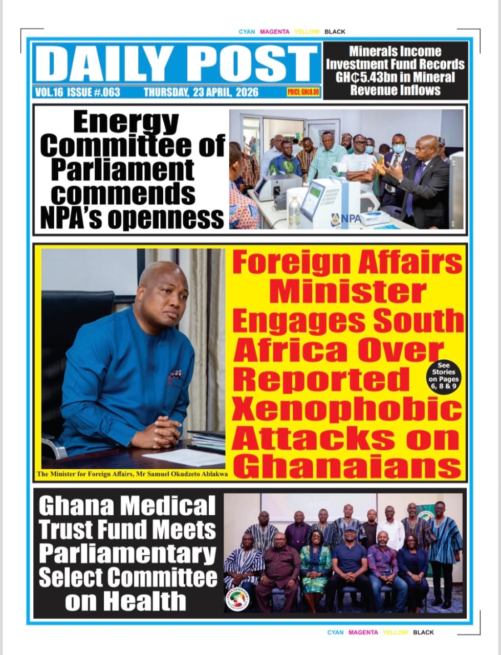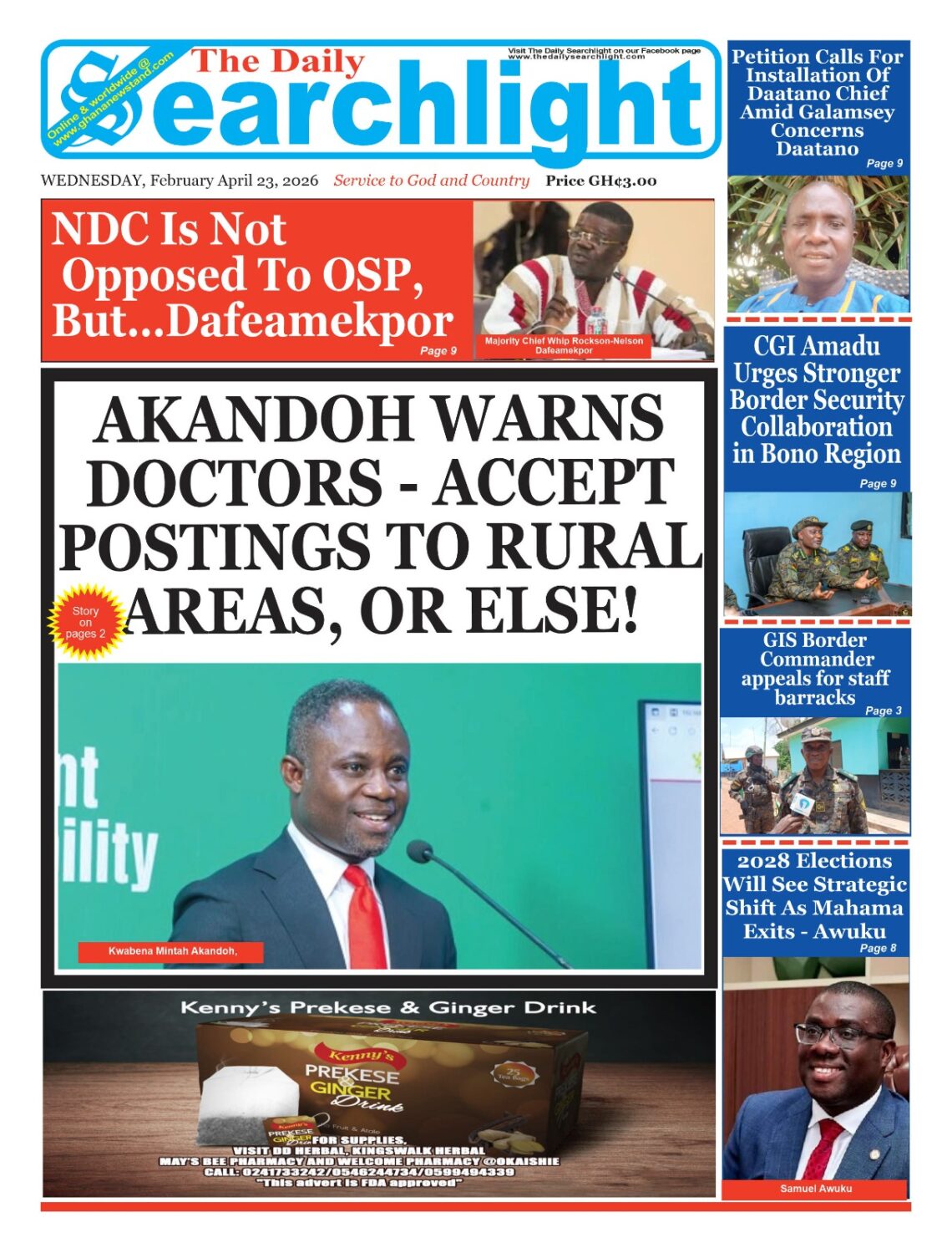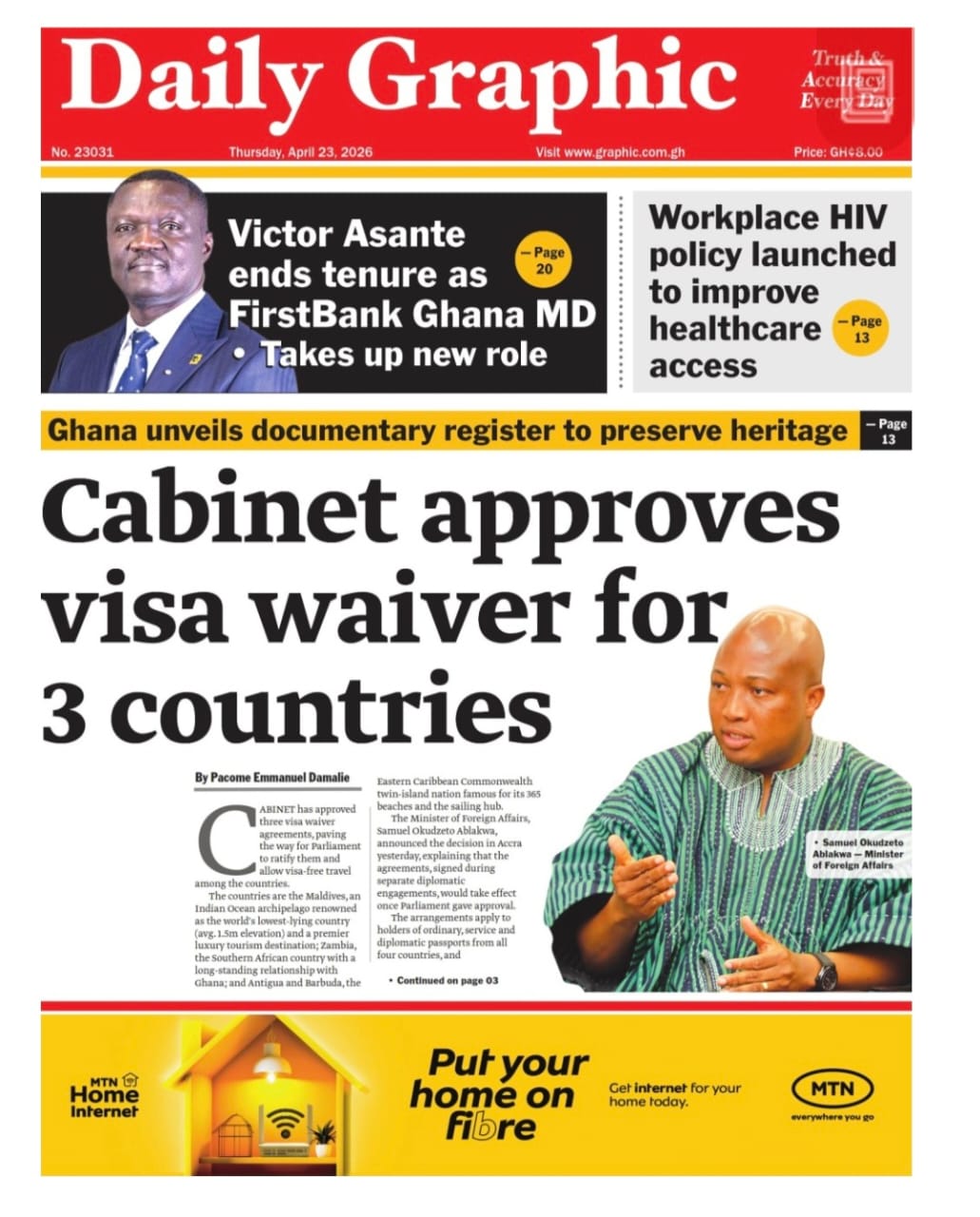 Newspaper headlines: Thursday, April 23, 2026 Newspaper Headlines April 23, 2026 7:34 am - Audio By Carbonatix DISCLAIMER: The Views, Comments, Opinions, Contributions and Statements made by Readers and Contributors on this platform do not necessarily represent the views or policy of Multimedia Group Limited. FacebookWhatsAppXTelegramEmailPinterestPrint Previous articleYou risk losing placements – Akandoh warns doctors over refusal of rural postingsNext articleHooligans terrorize Akyem Etwereso, residents call for urgent police intervention TagsNewspaper headlines RELATED ARTICLES Local News Vakpo Chief linguist who jumped bail convicted Local News GFA ExCo member sets records straight on Carlos Queiroz’s stay in hotel [Audio] Relationships Obra Show: DNA demand sparks heated clash between partners