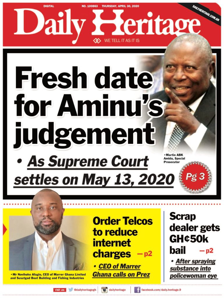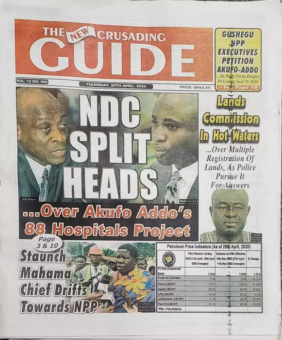 Newspaper Headlines: Thursday, April 30, 2020 SourceAdomonline.com Newspaper Headlines April 30, 2020 6:31 am - Audio By Carbonatix FacebookWhatsAppTwitterTelegramEmailPinterestPrint Previous articleTop Manhattan ER doctor commits suicide, shaken by coronavirus onslaughtNext article20 Burkinabés arrested after entering Ghana illegally RELATED ARTICLES Newspaper Headlines Newspaper headlines: Monday, November 24, 2025 Newspaper Headlines Newspaper headlines: Friday, November 21, 2025 Newspaper Headlines Newspaper headlines: Thursday, November 20, 2025