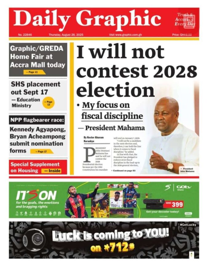 Newspaper headlines: Thursday, August 28, 2025 Newspaper Headlines August 28, 2025 7:47 am - Share FacebookWhatsAppTwitterTelegramEmailPinterestPrint FacebookWhatsAppTwitterTelegramEmailPinterestPrint Previous articleGRNMA challenges committee’s report on Ridge Hospital assaultNext articleRené Hiddink rejects Hearts of Oak’s settlement offer after FIFA ruling TagsNewspaper headlines RELATED ARTICLES Crime 11 suspects to face prosecution for 2020 and 2024 election violence Elections Muntaka confirms 15 deaths and 40 injuries from 2020 and 2024 election violence Entertainment News I was the female voice on P-Square’s ‘Do Me’ but earned nothing – Waje