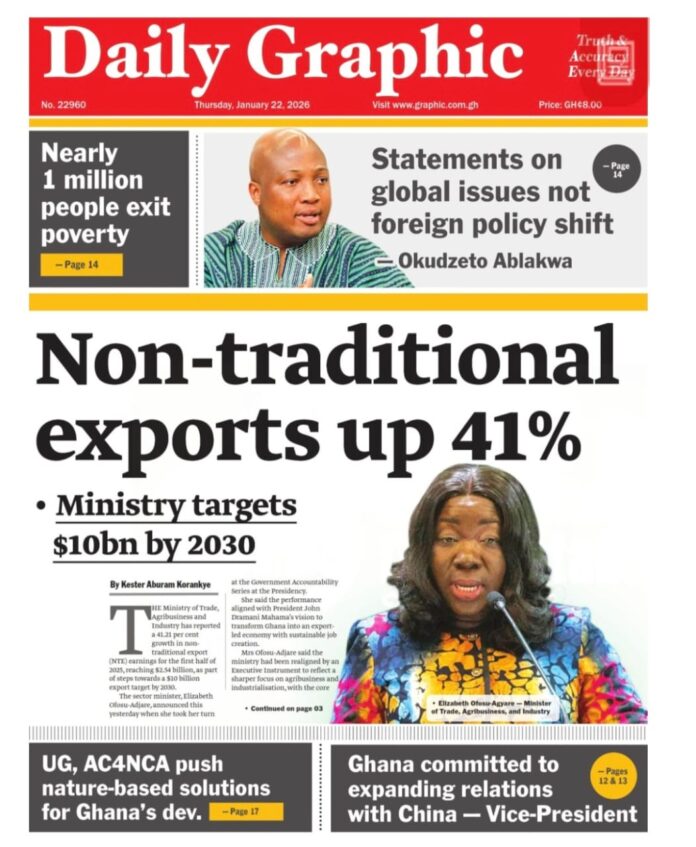 Newspaper headlines: Thursday, January 22, 2026 Newspaper Headlines January 22, 2026 7:25 am - Audio By Carbonatix Here are the front pages of some of Ghana’s newspapers today. FacebookWhatsAppTwitterTelegramEmailPinterestPrint Previous articleMalawi raises fuel prices by more than 40%Next articleAkufo-Addo chairs Commonwealth Observer Group for Bangladesh elections and referendum TagsNewspaper headlines RELATED ARTICLES Local News Anger after patient on admission at Awutu Bereku Health Centre dies while going to buy water Local News VRA/NEDCO releases load shedding timetable for Sunyani residents National Democratic Congress NDC suspends Oda Constituency Communication Officer over misconduct