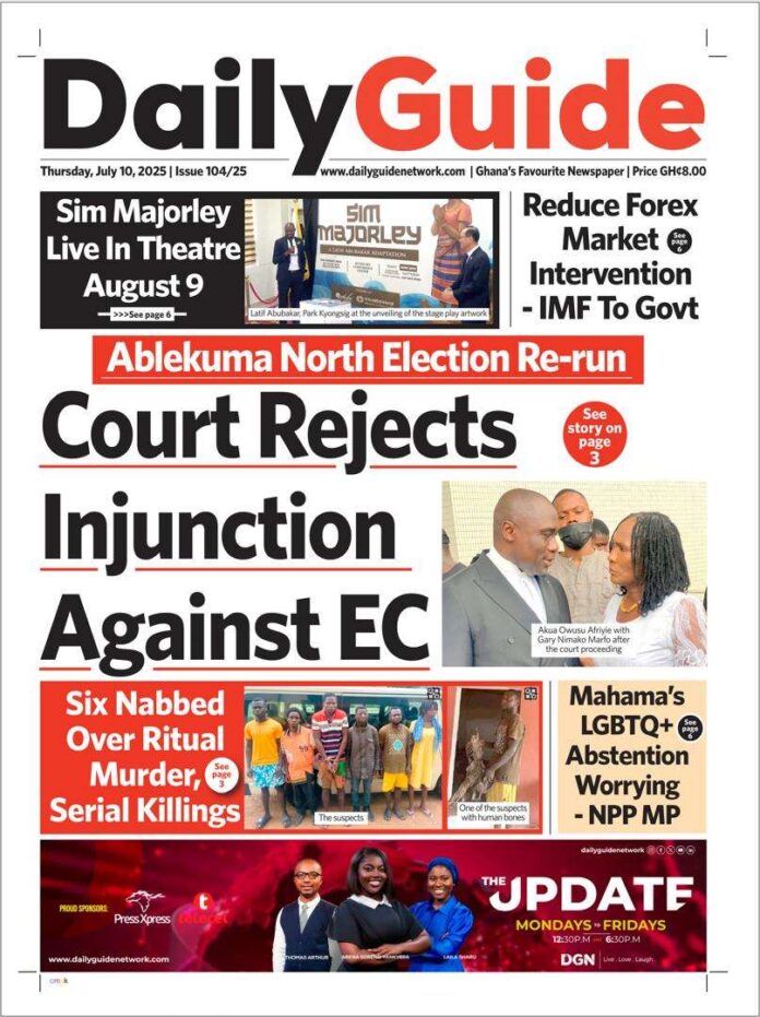 Newspaper headlines: Thursday, July 10, 2025 Newspaper Headlines July 10, 2025 6:47 am - Share FacebookWhatsAppTwitterTelegramEmailPinterestPrint FacebookWhatsAppTwitterTelegramEmailPinterestPrint Previous articleTrump asks Liberian president where he learned English, his country’s official languageNext articleDopeNation releases 3rd studio album GhanaPiano – A 17-track fusion of culture, energy, and sound TagsNewspaper headlines RELATED ARTICLES Local News NSMQ 2025: OWASS dominate semifinal to book grand finale spot against Mfantsipim and St. Augustine’s Education Haruna Iddrisu announces plans to extend university charter deadline Local News Hwidiem clashes: Nothing will stop me in the fight against galamsey – Asutifi North MP