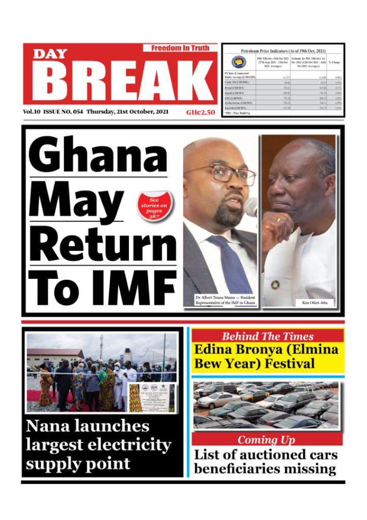 Newspaper Headlines: Thursday, October 21, 2021 Newspaper Headlines October 21, 2021 7:48 am - Audio By Carbonatix FacebookWhatsAppTwitterTelegramEmailPinterestPrint Previous articleGoogle to integrate Ghana Post GPS into Google map – BawumiaNext articleTrump to launch new social media platform TRUTH Social RELATED ARTICLES Newspaper Headlines Newspaper headlines: Monday, November 24, 2025 Newspaper Headlines Newspaper headlines: Friday, November 21, 2025 Newspaper Headlines Newspaper headlines: Thursday, November 20, 2025
