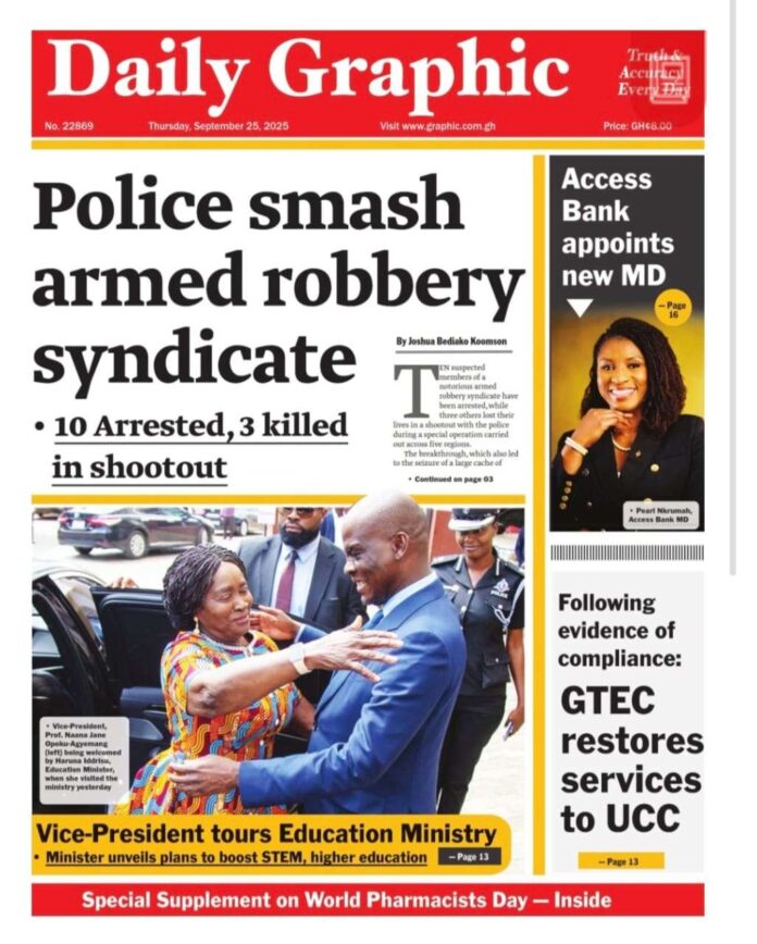 Newspaper headlines: Thursday, September 25, 2025 Newspaper Headlines September 25, 2025 6:42 am - Share FacebookWhatsAppTwitterTelegramEmailPinterestPrint FacebookWhatsAppTwitterTelegramEmailPinterestPrint Previous articleRussia will expand aggression beyond Ukraine if not stopped, Zelensky warnsNext articleTorkornoo not desperate to stay in office but… – Ayikoi Otoo TagsNewspaper headlines RELATED ARTICLES Crime 11 suspects to face prosecution for 2020 and 2024 election violence Elections Muntaka confirms 15 deaths and 40 injuries from 2020 and 2024 election violence Entertainment News I was the female voice on P-Square’s ‘Do Me’ but earned nothing – Waje