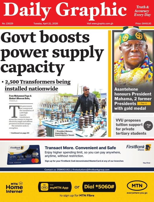 Newspaper headlines: Tuesday, April 21, 2026 Newspaper Headlines April 21, 2026 8:08 am - Audio By Carbonatix DISCLAIMER: The Views, Comments, Opinions, Contributions and Statements made by Readers and Contributors on this platform do not necessarily represent the views or policy of Multimedia Group Limited. FacebookWhatsAppXTelegramEmailPinterestPrint Previous articleKing Charles honours his ‘darling Mama’, the late Queen, on her centenaryNext articleAsantehene destools Kyeame Kofi Nti TagsNewspaper headlines RELATED ARTICLES Crime National Security operatives allegedly assault retired police officer in Ashanti region News Achimfo community raises funds to address pressing developmental issues Local News No vegetables mean no meals – Buffer Stock on SHS food shortage