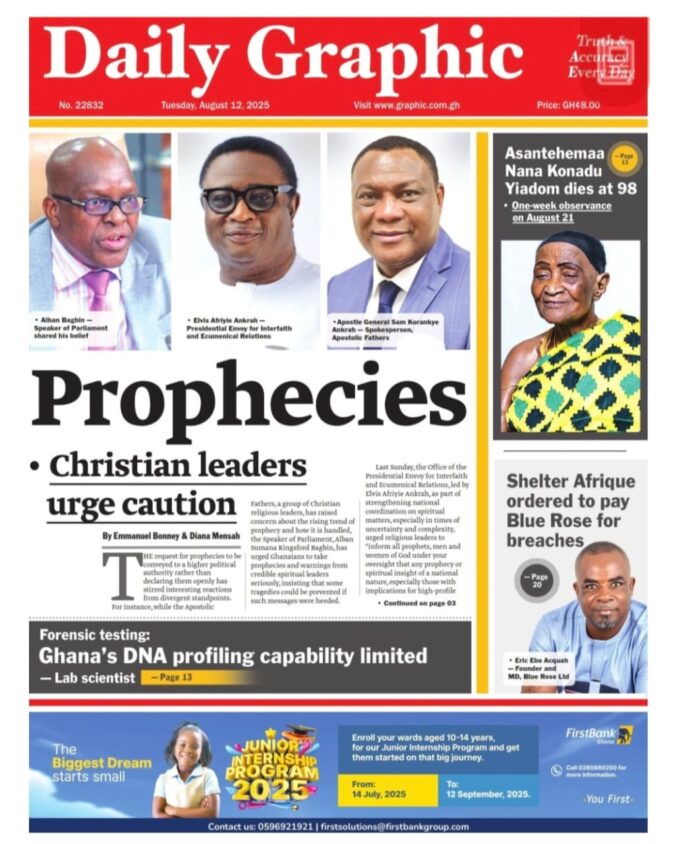 Newspaper headlines: Tuesday, August 12, 2025 Newspaper Headlines August 12, 2025 7:15 am - Share FacebookWhatsAppTwitterTelegramEmailPinterestPrint FacebookWhatsAppTwitterTelegramEmailPinterestPrint Previous articleHelicopter crash: São Tomé and Príncipe President mourns with GhanaNext articleBawumia pays glowing tribute to late Asantehemaa TagsNewspaper headlines RELATED ARTICLES crime Businessman jailed eight years for stealing Hot Audio Reckless and irresponsible – Elikem Kotoko slams attack on NAIMOS taskforce [Audio] Hot Audio Elikem Kotoko speaks on MP’s alleged involvement in NAIMOS attack [Audio]