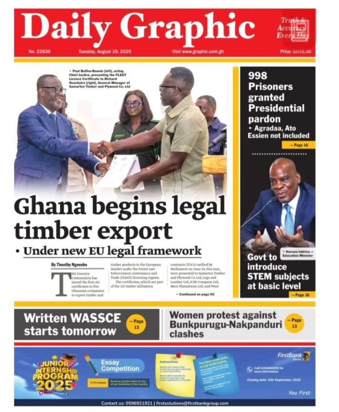 Newspaper headlines: Tuesday, August 19, 2025 Newspaper Headlines August 19, 2025 7:33 am - Share FacebookWhatsAppTwitterTelegramEmailPinterestPrint FacebookWhatsAppTwitterTelegramEmailPinterestPrint Previous articleCocoa farmers revolt over prices, as coalition threatens mass smugglingNext article“It was a dark moment; they painted me as the worst rogue ever ” – Uncle Ebo Whyte TagsNewspaper headlines RELATED ARTICLES Crime 11 suspects to face prosecution for 2020 and 2024 election violence Elections Muntaka confirms 15 deaths and 40 injuries from 2020 and 2024 election violence Entertainment News I was the female voice on P-Square’s ‘Do Me’ but earned nothing – Waje