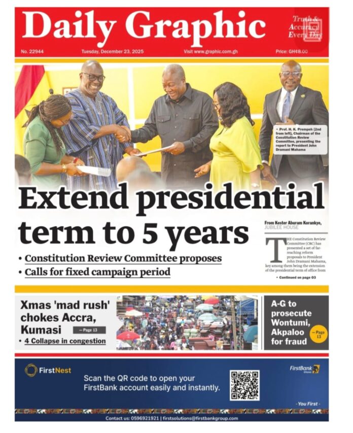 Newspaper headlines: Tuesday, December 23, 2025 Newspaper Headlines December 23, 2025 7:28 am - Audio By Carbonatix FacebookWhatsAppTwitterTelegramEmailPinterestPrint Previous articleSupreme Court affirms Alpha Beta Education Centre’s title to Akokorfoto landsNext articleConstitutional Review Committee proposes 15-member cap on Supreme Court TagsNewspaper headlines RELATED ARTICLES Local News 4-year presidential term has limited Ghana’s development – Alhassan Suhuyini Local News Ghana to launch coastal passenger and cargo shipping route to Nigeria Local News NSA scandal: AG hints at plans to file civil suit against suspectsÂ