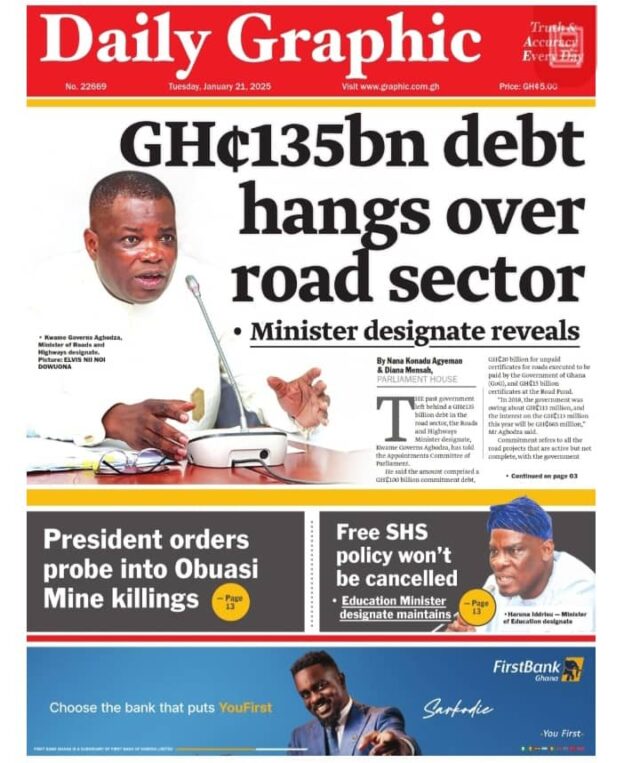 Newspaper headlines: Tuesday, January 21, 2025 Newspaper Headlines January 21, 2025 7:38 am - Audio By Carbonatix FacebookWhatsAppTwitterTelegramEmailPinterestPrint Previous articleUCL preview: Benfica host Barcelona as PSG clash with Man CityNext articleZverev earns hard-fought win over Paul to reach semis TagsNewspaper headlines RELATED ARTICLES Business MGL, poultry farmers roll out X’mas Egg Market to tackle egg glut Local News NRSA blames theft for breakdown of many traffic lights News Ghana Card to be mandatory for motor insurance from January 2026