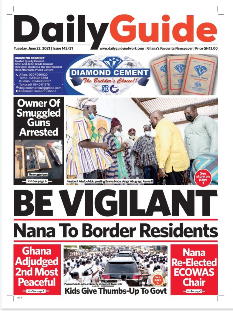 Newspaper Headlines: Tuesday, June 22, 2021 News June 22, 2021 7:49 am - Audio By Carbonatix FacebookWhatsAppTwitterTelegramEmailPinterestPrint Previous articleSHS student beats teacher to pulp, stabs security man with broken bottleNext articleEuro 2020: Emotional win sees Denmark through to face Wales in last 16 RELATED ARTICLES Business TAGG hails government for scrapping COVID-19 levy Business Transport operators issue three-day ultimatum to clear traders from roads Local News Kpandai rerun: NPP more united than NDC – Mussa Dankwah