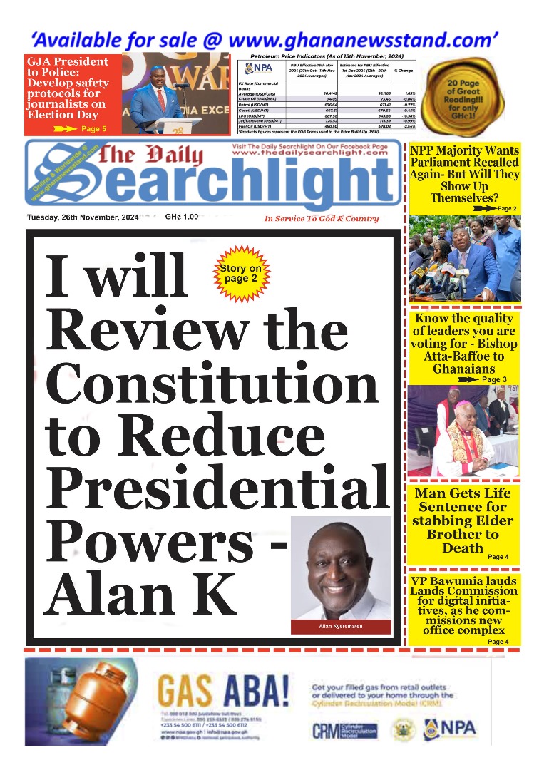 Newspaper headlines: Tuesday, November 26, 2024 Newspaper Headlines November 26, 2024 8:35 am - Audio By Carbonatix FacebookWhatsAppTwitterTelegramEmailPinterestPrint Previous articleGov’t to align teacher training programmes with global standardsNext articleDe Bruyne unsure over Man City future TagsNewspaper headlines RELATED ARTICLES News Four arraigned over importation of cannabis concealed in gift box Nigeria Nigeria’s richest man Dangote escalates oil fight with regulator, seeks corruption probe Local News Otumfuo chastises Bono Regional Minister for using his political position to meddle in Sampa chieftaincy affairs