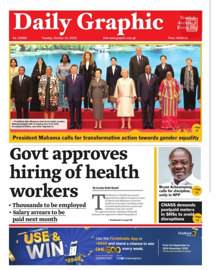 Newspaper headlines: Tuesday, October 14, 2025 Newspaper Headlines October 14, 2025 7:05 am - Share FacebookWhatsAppTwitterTelegramEmailPinterestPrint FacebookWhatsAppTwitterTelegramEmailPinterestPrint Previous articleFinance Minister leads Ghana’s delegation to IMF/World Bank annual meetings in WashingtonNext article343 mining rights granted, about 1.1m jobs created in 2024 – NDPC report TagsNewspaper headlines RELATED ARTICLES Education Haruna Iddrisu announces plans to extend university charter deadline Local News Hwidiem clashes: Nothing will stop me in the fight against galamsey – Asutifi North MP News Bernard Ahiafor and Collins Dauda sworn in as members of Pan-African Parliament