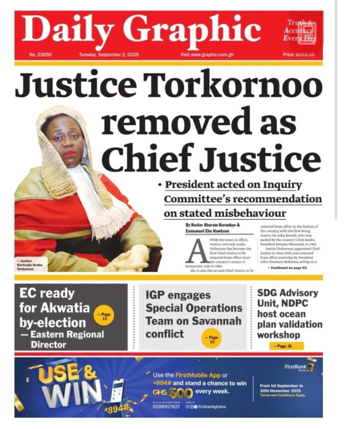 Newspaper headlines: Tuesday, September 2, 2025 Newspaper Headlines September 2, 2025 7:10 am - Share FacebookWhatsAppTwitterTelegramEmailPinterestPrint FacebookWhatsAppTwitterTelegramEmailPinterestPrint Previous articleNew $250 visa fee risks deepening US travel slumpNext articleTrump defends U-turn on Chinese student visas after Maga backlash TagsNewspaper headlines RELATED ARTICLES Local News Interior Ministry announces nationwide recruitment for security agencies Local News Tamale High Court slaps Tolon-Naa, 5 others with GH¢50k damages in 300-acre land dispute Local News Germany commits €65 million to support Ghana’s development agenda