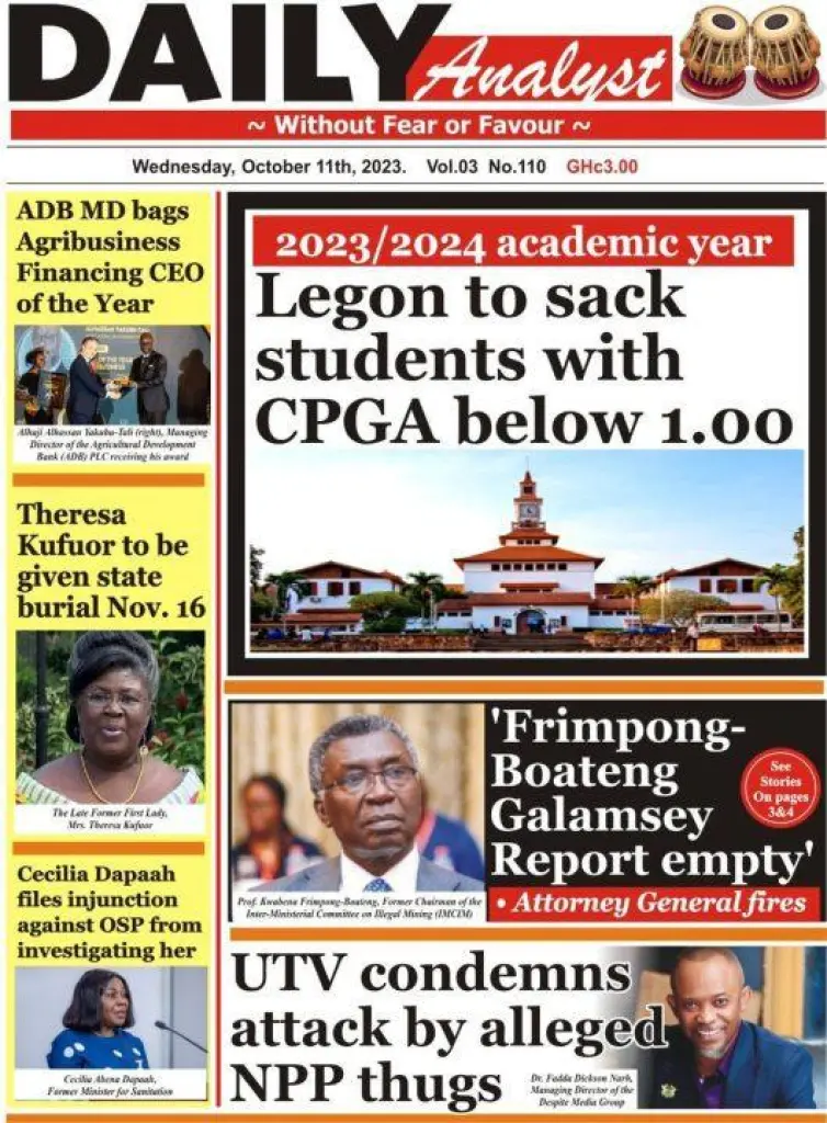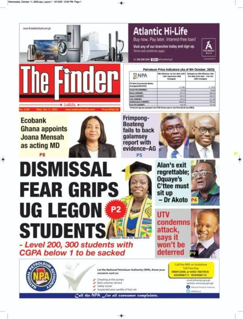 Newspaper headlines : Wednesday 11th October 2023 Newspaper Headlines October 11, 2023 8:10 am - Audio By Carbonatix FacebookWhatsAppTwitterTelegramEmailPinterestPrint Previous articleGlobal Black Impact Summit to Build Next Generation of EntrepreneursNext articleMaj. Mahama murder trial near completion RELATED ARTICLES Newspaper Headlines Newspaper headlines: Monday, November 24, 2025 Newspaper Headlines Newspaper headlines: Friday, November 21, 2025 Newspaper Headlines Newspaper headlines: Thursday, November 20, 2025