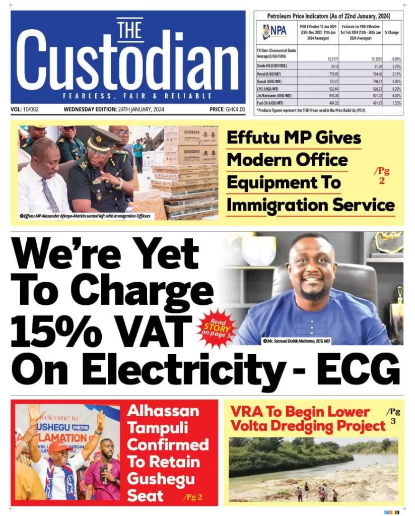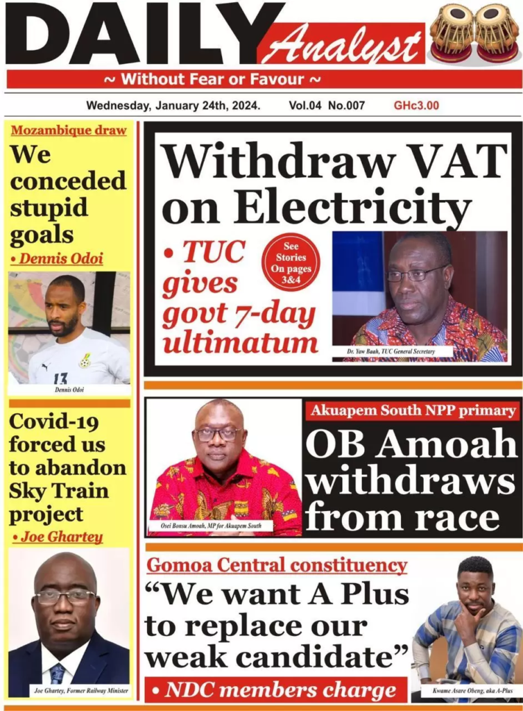 Newspaper headlines: Wednesday 24th January 2024 NewsNewspaper Headlines January 24, 2024 6:43 am - Audio By Carbonatix FacebookWhatsAppTwitterTelegramEmailPinterestPrint Previous articleWhy I withdrew from NPP parliamentary race – OB AmoahNext articleTeacher who impersonated Akan MP fined TagsNewspaper headlines RELATED ARTICLES Politics Bawumia cannot be the cause of NPP’s loss – Nana Akomea refutes Bryan Acheampong’s assertion Local News Central Regional Minister withdraws DRIP equipment from Upper Denkyira West News Diaspora Global Education Conference: Education must be opportunity-centred – Dr. Apaak