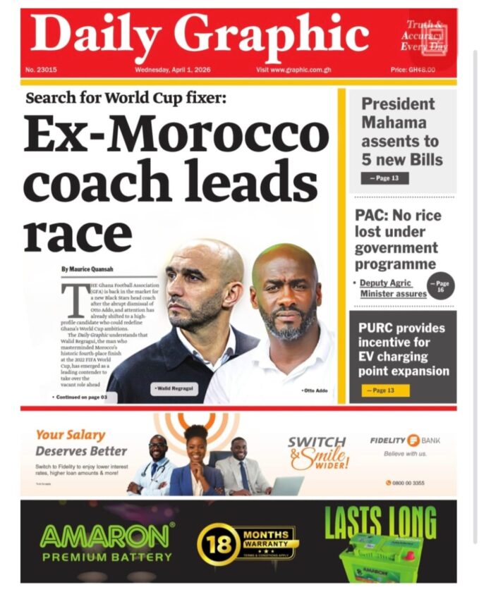 Newspaper headlines: Wednesday, April 1, 2026 Newspaper Headlines April 1, 2026 7:40 am - Audio By Carbonatix DISCLAIMER: The Views, Comments, Opinions, Contributions and Statements made by Readers and Contributors on this platform do not necessarily represent the views or policy of Multimedia Group Limited. FacebookWhatsAppXTelegramEmailPinterestPrint Previous article24-Hour Economy Authority, NPA sign MoU to drive round-the-clock petroleum operationsNext articleGWL attributes Kokomlemle water crises to rationing, localised faults after JoyNews report TagsNewspaper headlines RELATED ARTICLES News Eight suspected highway robbers arrested in Ashanti North, one killed in police operation Local News Mahama to review IMANI petition on insurance sector concerns – Kwakye Ofosu Local News Chiefs call on President to commission responsible cooperative mining at Mim to address galamasey, unemployment