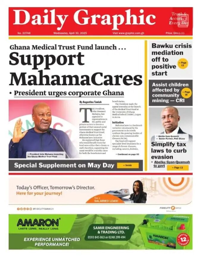 Newspaper headlines: Wednesday, April 30, 2025 Newspaper Headlines April 30, 2025 8:48 am - Audio By Carbonatix FacebookWhatsAppTwitterTelegramEmailPinterestPrint Previous article‘The law is not in the bosom of the Bar’ – Thaddeus Sory unleashes legal fire on GBANext articleChelsea confirm front-of-shirt sponsor for remainder of 2024/25 season TagsNewspaper headlines RELATED ARTICLES Business New Barari Lithium agreement guarantees greater gains for Ghana – Minister Local News Fire Service begins Nationwide Safety sweep ahead of 24-Hour Economy launch [Photos] Business Egg-citing deals as The Multimedia Group’s X’mas Egg Market sells out on Day 1, returns tomorrow