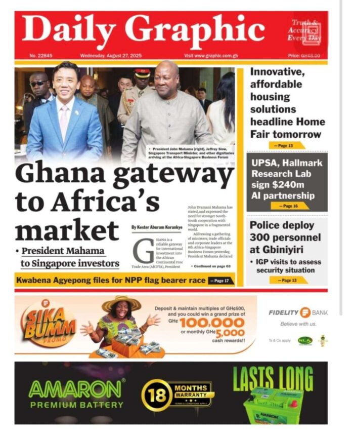 Newspaper headlines: Wednesday, August 27, 2025 Newspaper Headlines August 27, 2025 6:59 am - Share FacebookWhatsAppTwitterTelegramEmailPinterestPrint FacebookWhatsAppTwitterTelegramEmailPinterestPrint Previous articleTrump administration asks US Supreme Court to halt foreign aid paymentsNext articleAmbassador-Designate Kojo Choi meets NDPC Chairman on strengthening Ghana–South Korea ties TagsNewspaper headlines RELATED ARTICLES Crime 11 suspects to face prosecution for 2020 and 2024 election violence Elections Muntaka confirms 15 deaths and 40 injuries from 2020 and 2024 election violence Entertainment News I was the female voice on P-Square’s ‘Do Me’ but earned nothing – Waje