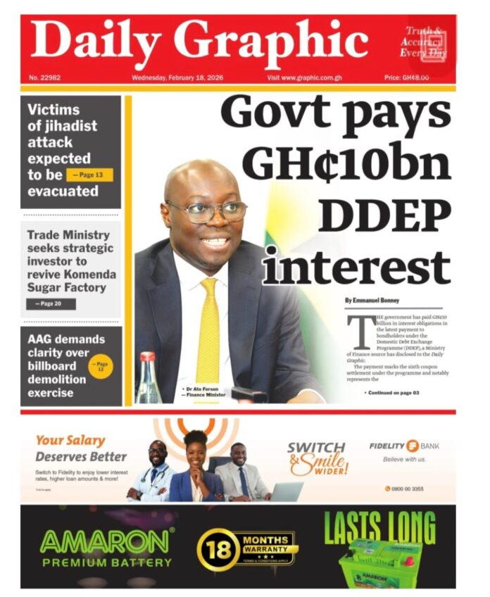 Newspaper headlines: Wednesday, February 18, 2026 Newspaper Headlines February 18, 2026 8:02 am - Audio By Carbonatix FacebookWhatsAppTwitterTelegramEmailPinterestPrint Previous articleMentally challenged man allegedly butchers mother, brother at Offinso-AchiaseNext articleMother, 2 sons die in violent family feud at Barekese-Achiase TagsNewspaper headlines RELATED ARTICLES Business Komenda Sugar Factory disconnected from power, water supply over debts News Gold fever hits South Africa after lucky find in cattle pen Local News Man dies in galamsey pit collapse at Chirano