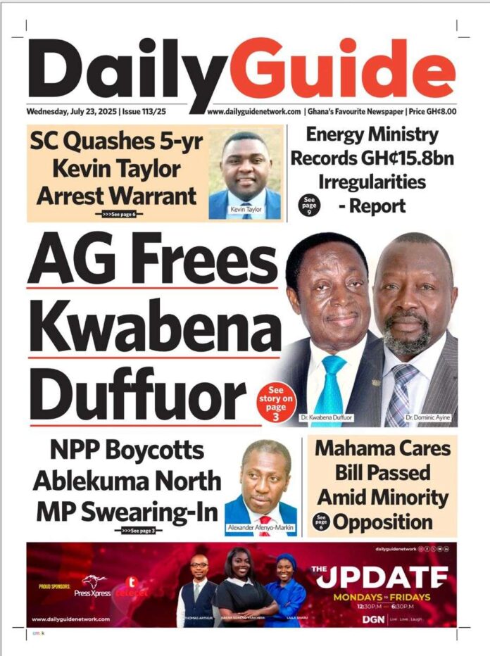 Newspaper headlines: Wednesday, July 23, 2025 Newspaper Headlines July 23, 2025 6:26 am - Share FacebookWhatsAppTwitterTelegramEmailPinterestPrint FacebookWhatsAppTwitterTelegramEmailPinterestPrint Previous articleBoG announces new guidelines on application of exchange rate by players in shipping industryNext articleQueen Elizabeth II’s fashion to feature in exhibition TagsNewspaper headlines RELATED ARTICLES Local News NSMQ 2025: OWASS dominate semifinal to book grand finale spot against Mfantsipim and St. Augustine’s Education Haruna Iddrisu announces plans to extend university charter deadline Local News Hwidiem clashes: Nothing will stop me in the fight against galamsey – Asutifi North MP