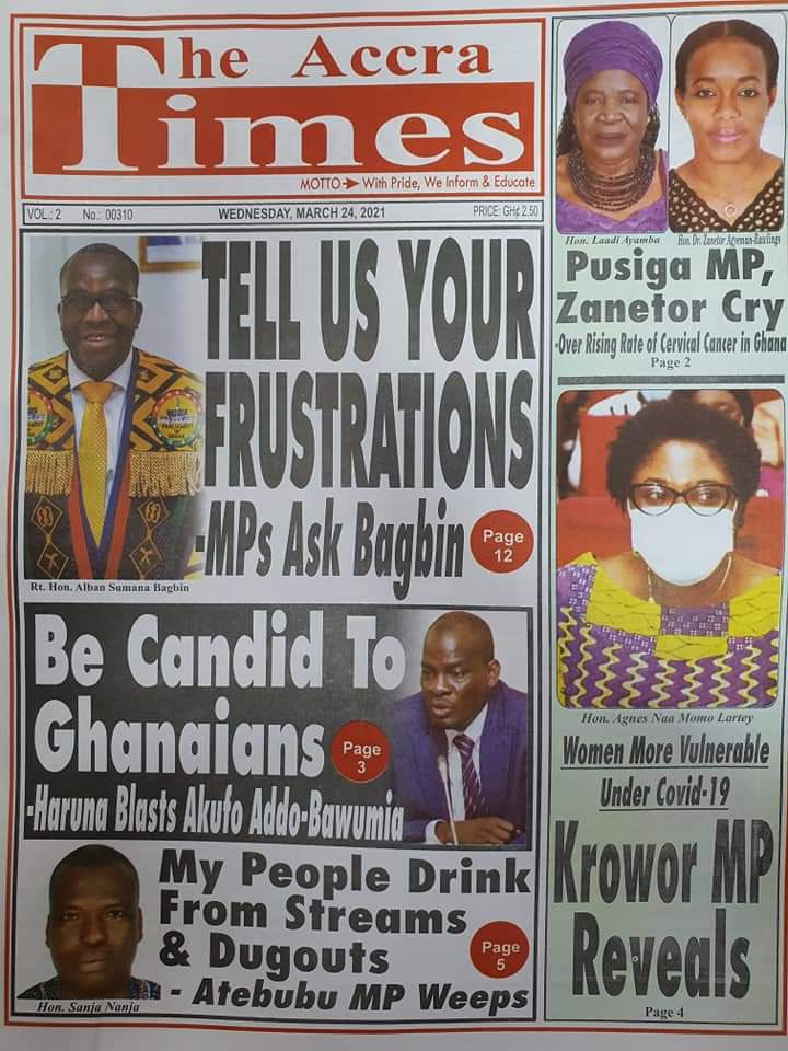 Newspaper Headlines: Wednesday, March 24, 2021 Newspaper Headlines March 24, 2021 7:18 am - Audio By Carbonatix FacebookWhatsAppTwitterTelegramEmailPinterestPrint Previous articleFour-year-old boy abducted from school at Nkawkaw, Police appeal for help from publicNext articleJuaboso: Armed robbers hijack road, rob passengers twice in a day RELATED ARTICLES Newspaper Headlines Newspaper headlines: Monday, November 24, 2025 Newspaper Headlines Newspaper headlines: Friday, November 21, 2025 Newspaper Headlines Newspaper headlines: Thursday, November 20, 2025