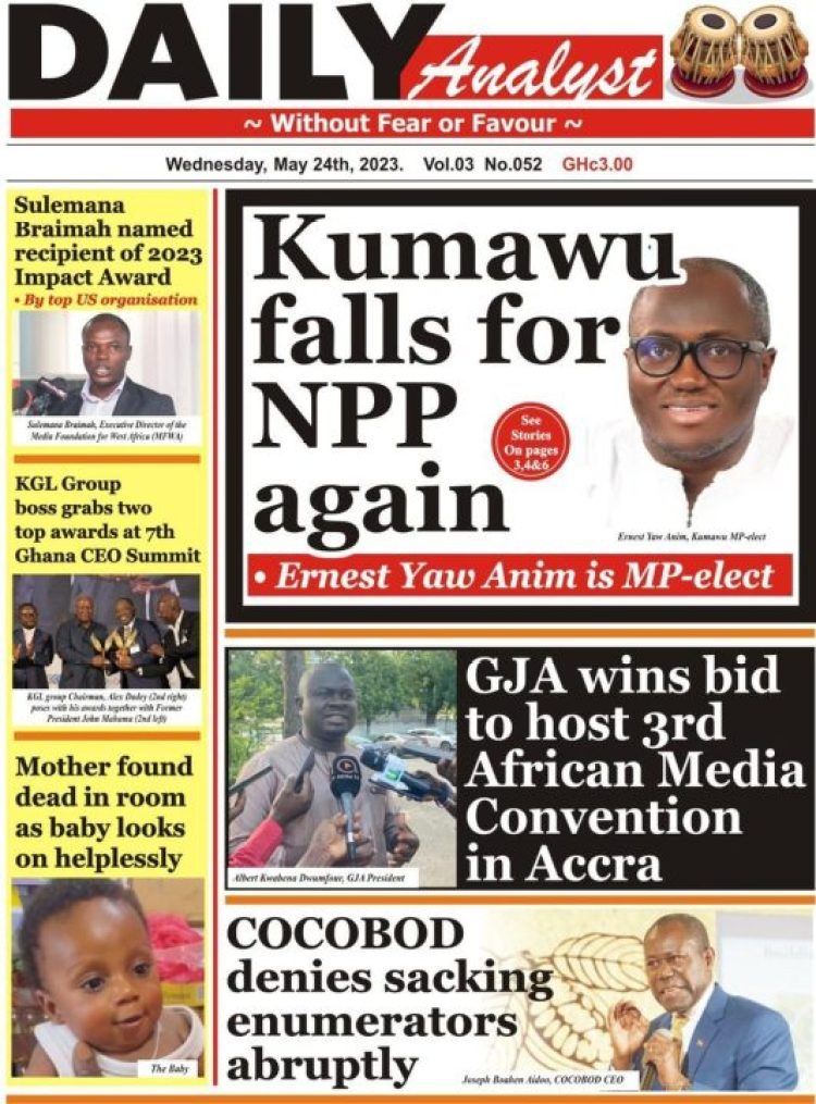 Newspaper Headlines: Wednesday, May 24, 2023 Newspaper Headlines May 24, 2023 6:36 am - Audio By Carbonatix FacebookWhatsAppTwitterTelegramEmailPinterestPrint Previous articleKumawu bye-election: NPP supporters in jubilant moodNext articleNPP’s Ernest Yaw Anim wins Kumawu bye-election RELATED ARTICLES Newspaper Headlines Newspaper headlines: Monday, November 24, 2025 Newspaper Headlines Newspaper headlines: Friday, November 21, 2025 Newspaper Headlines Newspaper headlines: Thursday, November 20, 2025
