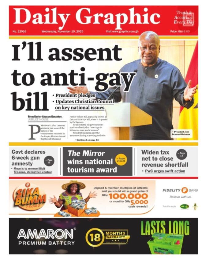 Newspaper headlines: Wednesday, November 19, 2025 Newspaper Headlines November 19, 2025 6:48 am - Share FacebookWhatsAppTwitterTelegramEmailPinterestPrint Here are the front pages of some of Ghana’s newspapers today. Discover more Prime news ghana Prime News Ghana Primenewsghana FacebookWhatsAppTwitterTelegramEmailPinterestPrint Previous articleNations FC backs head coach Frimpong Manso after tough startNext articleTravellers, including soldiers robbed on Berekum–Sampa road TagsNewspaper headlines RELATED ARTICLES Local News Heath Goldfields confirms three deaths at Bogoso-Prestea concession International Diddy denies sexual battery allegation after Los Angeles authorities open probe National Democratic Congress “First person to bring scandal to my gov’t will be hanged on a cross” – Mahama