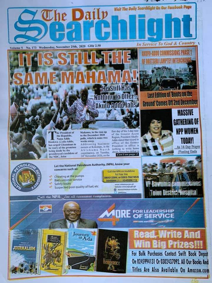 Newspaper Headlines: Wednesday, November 25, 2020 Newspaper Headlines November 25, 2020 7:23 am - Audio By Carbonatix FacebookWhatsAppTwitterTelegramEmailPinterestPrint Previous articleCPP to revive over 50 collapsed factories for job creationNext articleElection 2020: Kwesi Pratt sends strong message to NPP RELATED ARTICLES Newspaper Headlines Newspaper headlines: Monday, November 24, 2025 Newspaper Headlines Newspaper headlines: Friday, November 21, 2025 Newspaper Headlines Newspaper headlines: Thursday, November 20, 2025