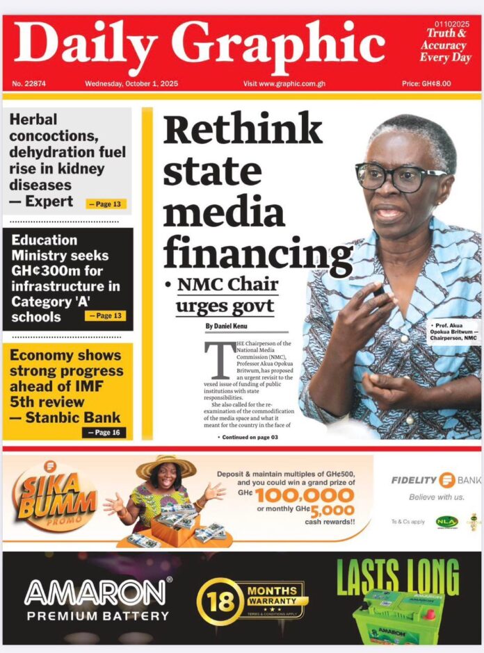 Newspaper headlines: Wednesday, October 1, 2025 Newspaper Headlines October 1, 2025 6:58 am - Share FacebookWhatsAppTwitterTelegramEmailPinterestPrint FacebookWhatsAppTwitterTelegramEmailPinterestPrint Previous articleBond market: Turnover decline by 18% to GH¢906.14mNext articleSilva ‘knows what to do’ when Man City contract ends TagsNewspaper headlines RELATED ARTICLES Top Story Committee submits report on August 6 helicopter crash to Mahama Local News Justice Baffoe-Bonnie defends Ataa Ayi’s 70-year jail term Local News Baffoe-Bonnie hints at 24-hour courts to improve access to justice