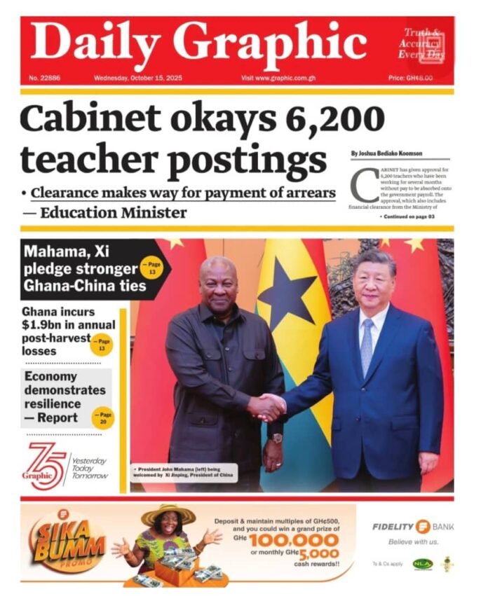 Newspaper headlines: Wednesday, October 15, 2025 Newspaper Headlines October 15, 2025 6:38 am - Share FacebookWhatsAppTwitterTelegramEmailPinterestPrint FacebookWhatsAppTwitterTelegramEmailPinterestPrint Previous articleGhana to host first AETF AI Conference in NovemberNext articleGIS repatriates 32 West Africans for alleged roles in cybercrime TagsNewspaper headlines RELATED ARTICLES Crime 11 suspects to face prosecution for 2020 and 2024 election violence Elections Muntaka confirms 15 deaths and 40 injuries from 2020 and 2024 election violence Entertainment News I was the female voice on P-Square’s ‘Do Me’ but earned nothing – Waje