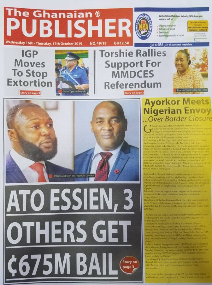 Newspaper Headlines: Wednesday, October 16, 2019 Newspaper HeadlinesUncategorized October 16, 2019 6:19 am - Audio By Carbonatix FacebookWhatsAppTwitterTelegramEmailPinterestPrint Previous articleNduom reacts to demo by Gold Coast CustomersNext articleMan takes ‘a shit’ in front of Flagstaff House RELATED ARTICLES Newspaper Headlines Newspaper headlines: Monday, November 24, 2025 Newspaper Headlines Newspaper headlines: Friday, November 21, 2025 Newspaper Headlines Newspaper headlines: Thursday, November 20, 2025
