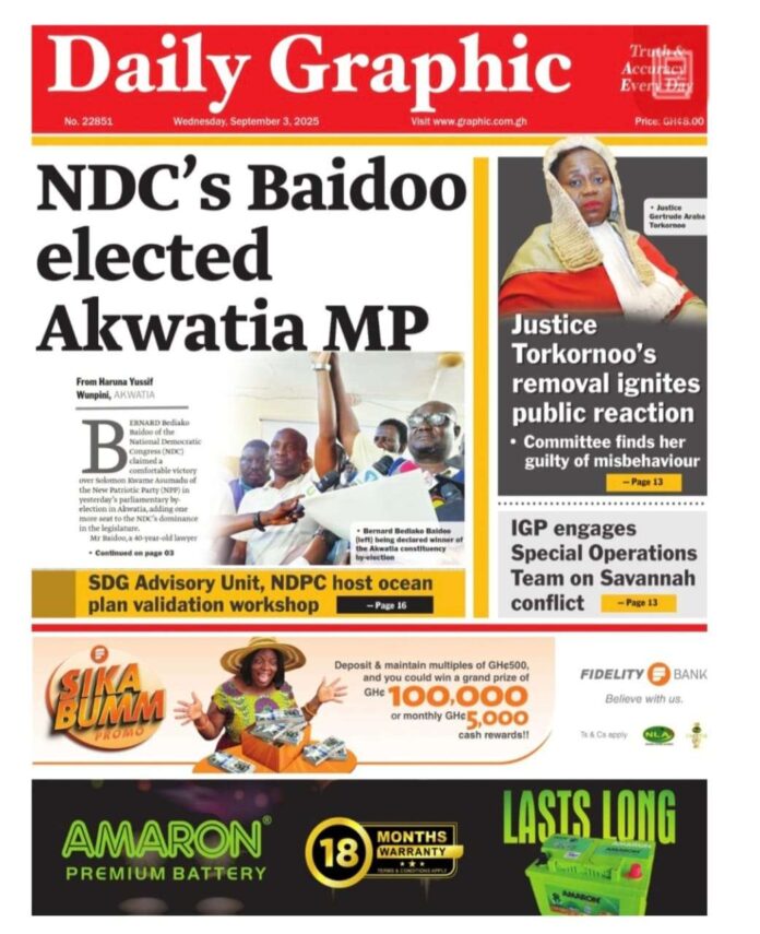 Newspaper headlines: Wednesday, September 3, 2025 Newspaper Headlines September 3, 2025 6:59 am - Share FacebookWhatsAppTwitterTelegramEmailPinterestPrint FacebookWhatsAppTwitterTelegramEmailPinterestPrint Previous articleBurkina Faso’s parliament votes to outlaw homosexual actsNext articleTwo women arrested over abusive statements against Mahama weep in court TagsNewspaper headlines RELATED ARTICLES Crime “My case is useless” — Mustapha Hamid downplays OSP prosecution Local News Asutifi North NPP condemns MP over alleged attack on NAIMOS Operations News Former US Vice President Dick Cheney passes on