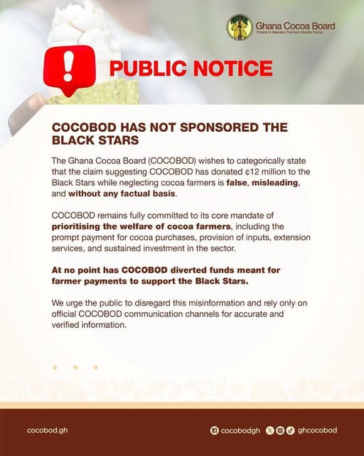 Responding to circulating social media reports linking cocoa funds to football sponsorship, the board described the allegations as “false, misleading, and without any factual basis.”