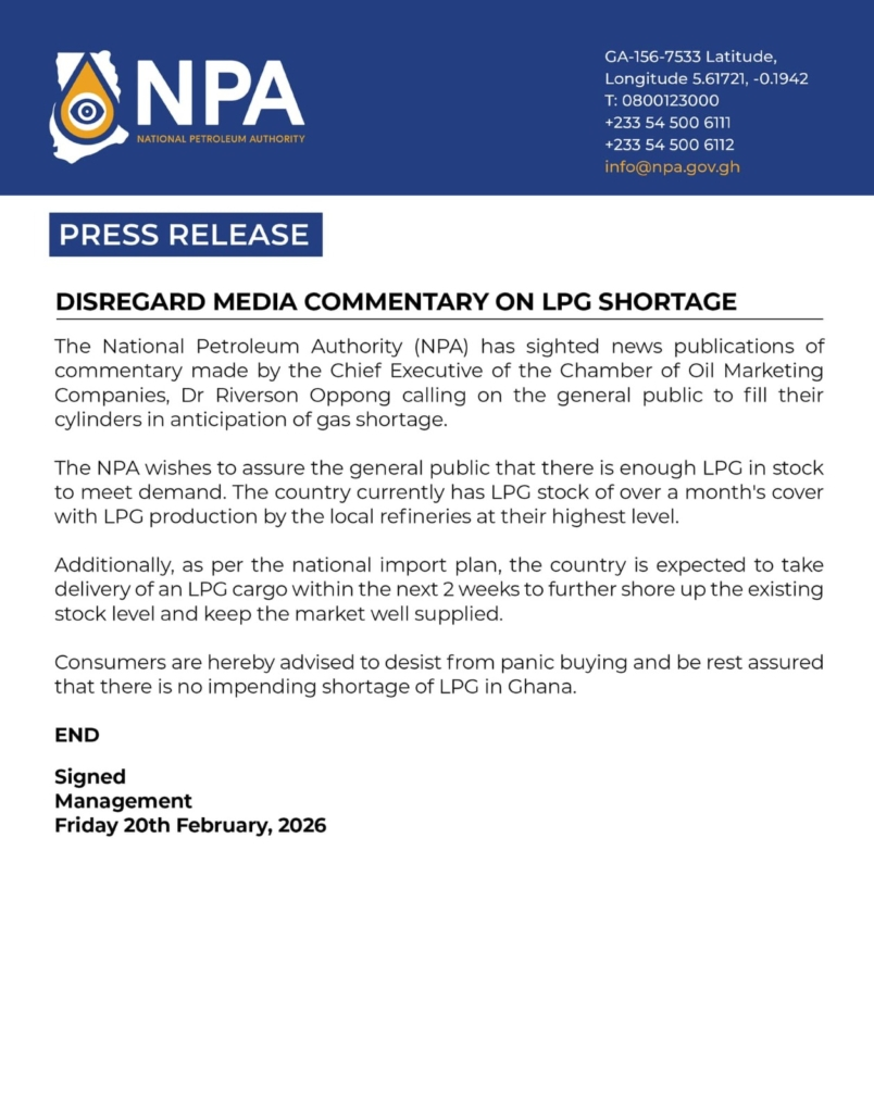 The National Petroleum Authority (NPA) has acted quickly to calm growing concerns over a possible energy crunch, firmly dismissing reports of an impending Liquefied Petroleum Gas (LPG) shortage.