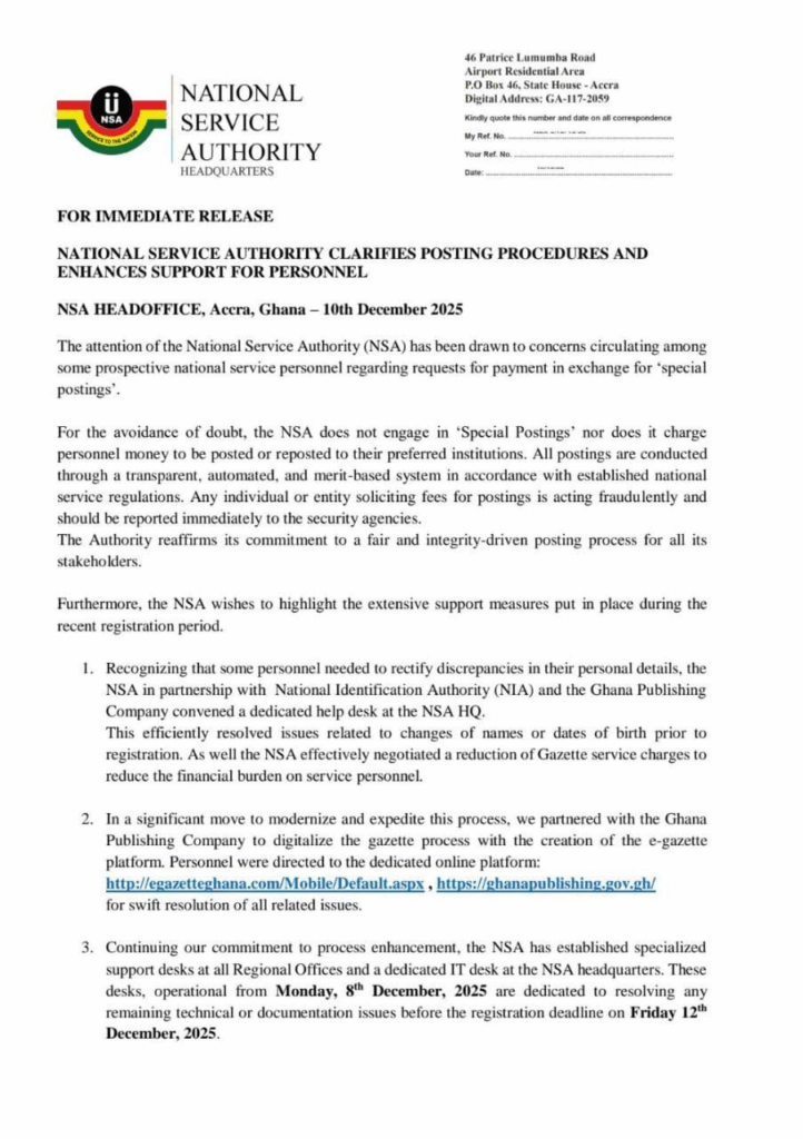 In a statement, the NSA clarified that it does not charge for postings or repostings, nor does it offer preferential placements in exchange for money. The Authority emphasised that all deployments are conducted through a fully automated, transparent, and merit-based system in strict compliance with national service regulations.