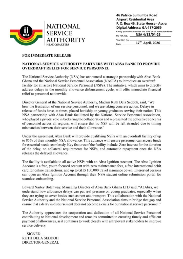 The National Service Authority (NSA) has entered into a strategic partnership with Absa Bank Ghana and the National Service Personnel Association (NASPA) to introduce an overdraft facility for all active National Service Personnel (NSPs).